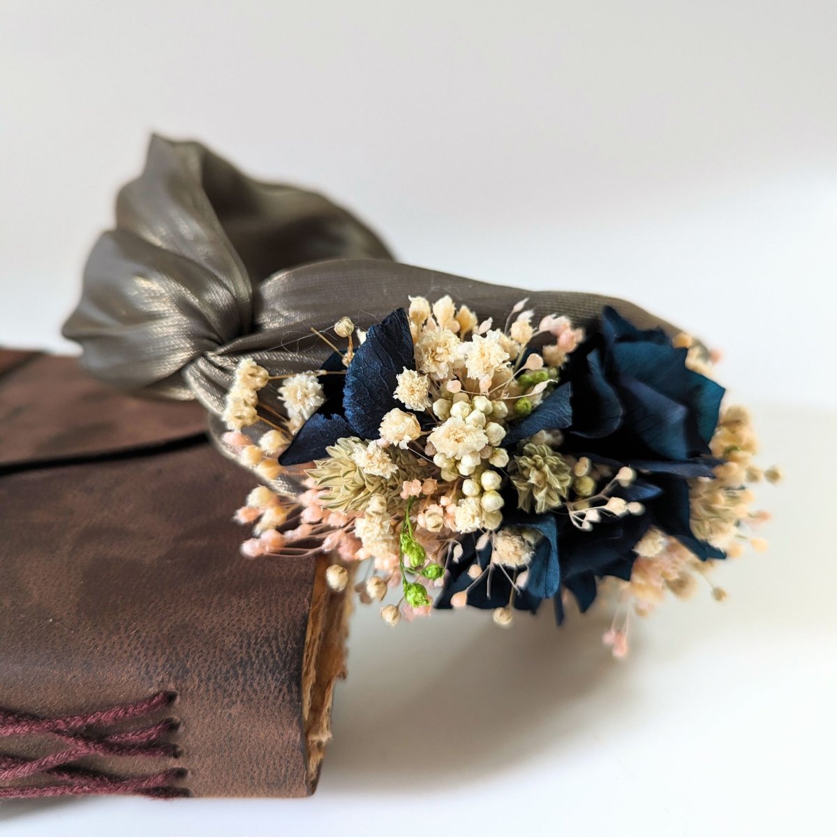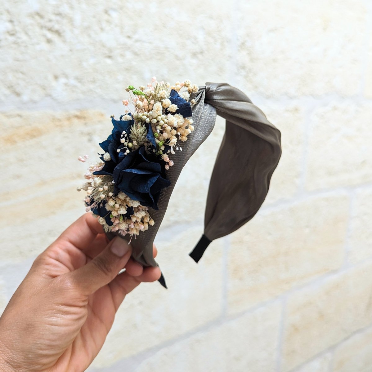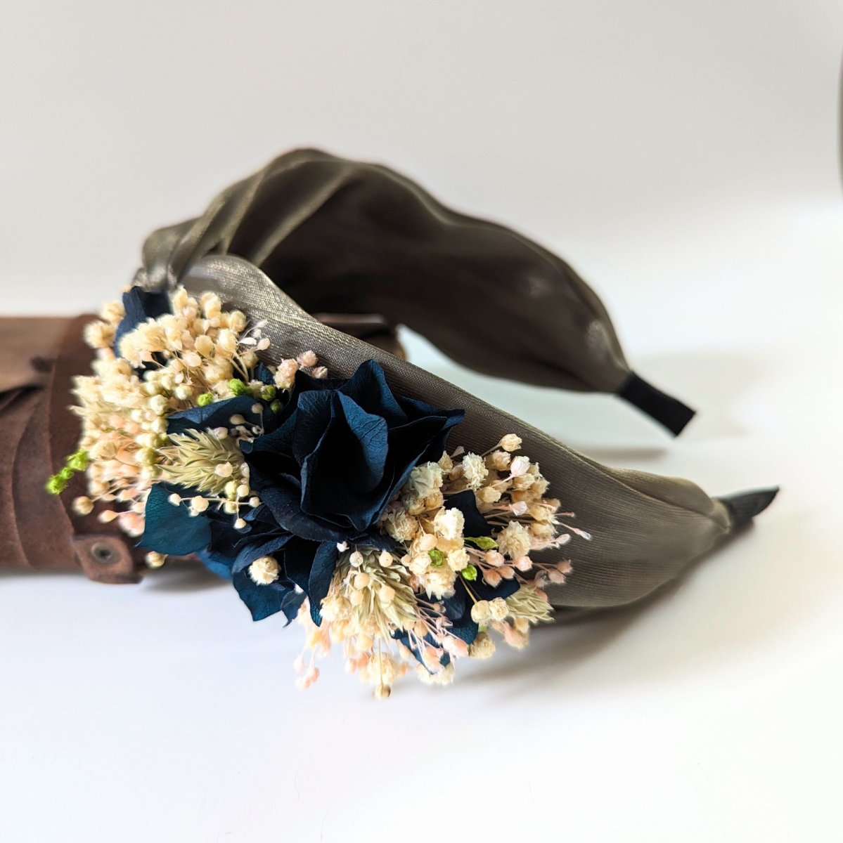 Serre-tête artisanal orné de fleurs séchées & stabilisées bleues, Mona