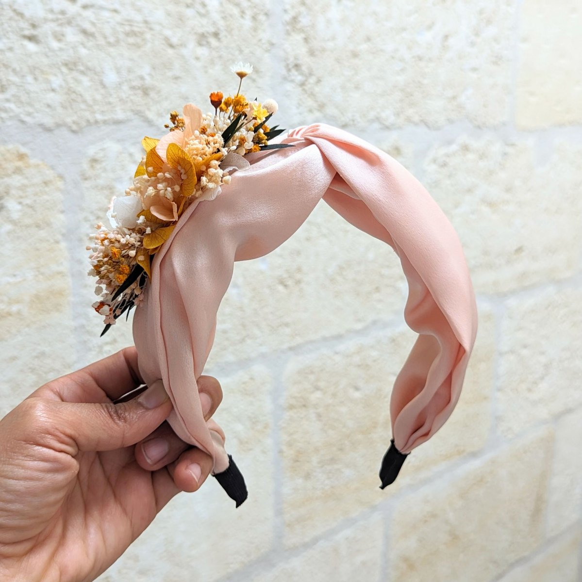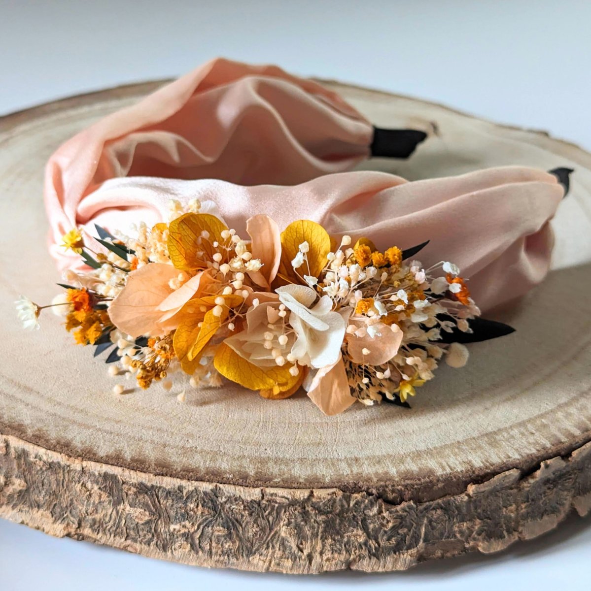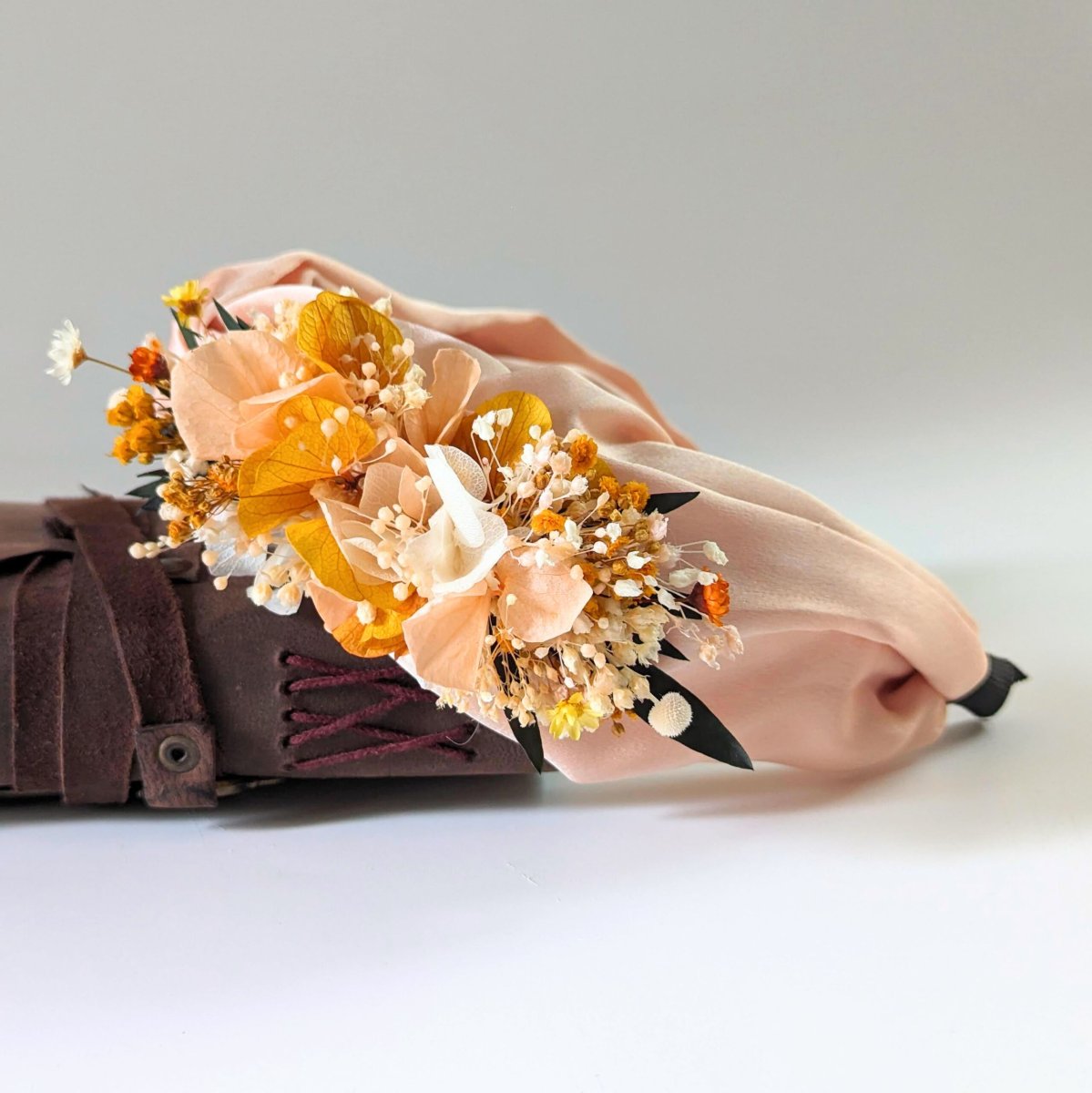 Serre-tête artisanal orné de fleurs séchées & stabilisées orangées, Chloé