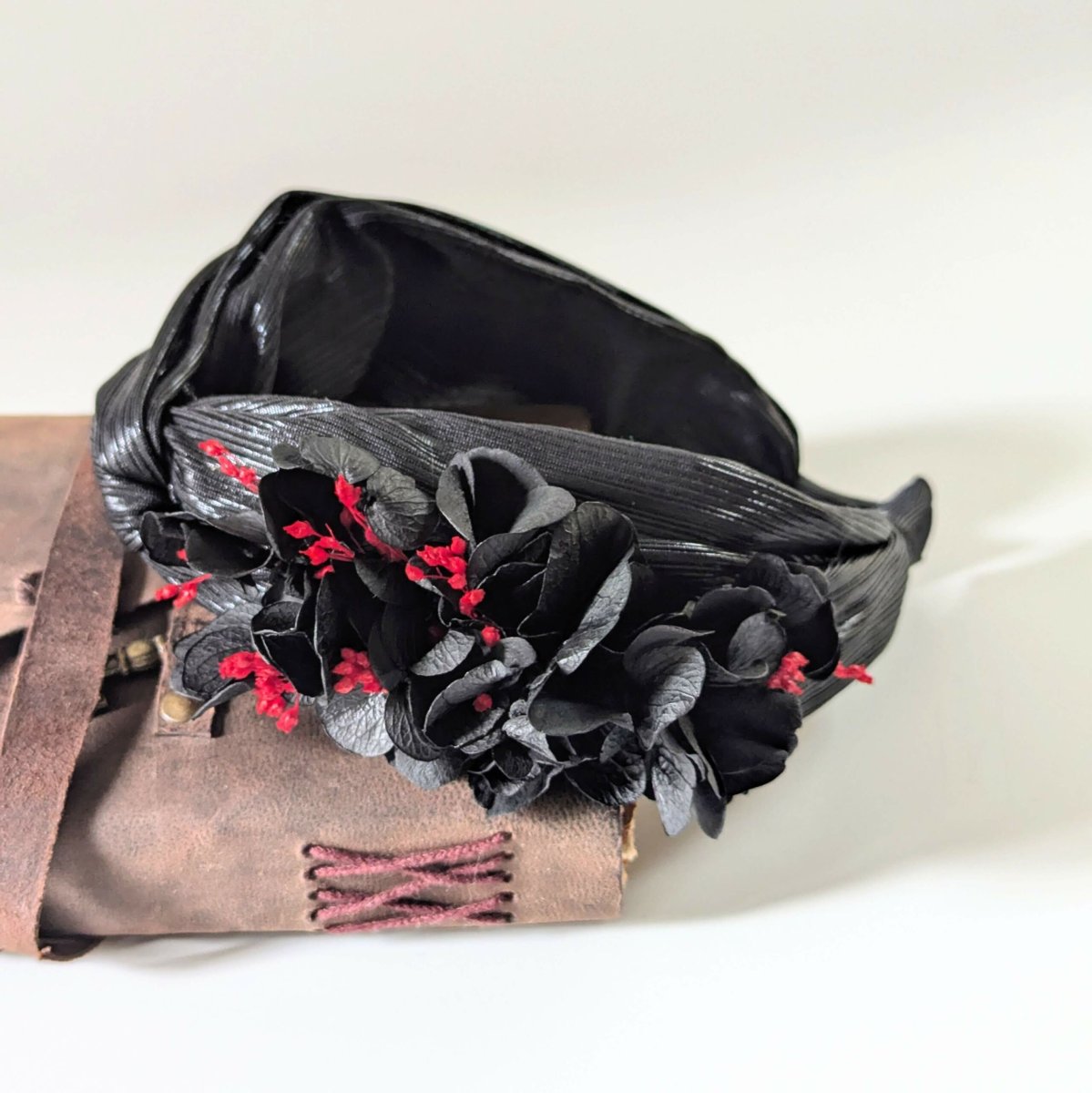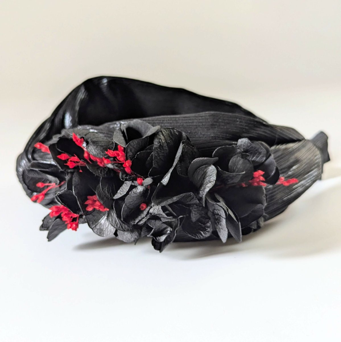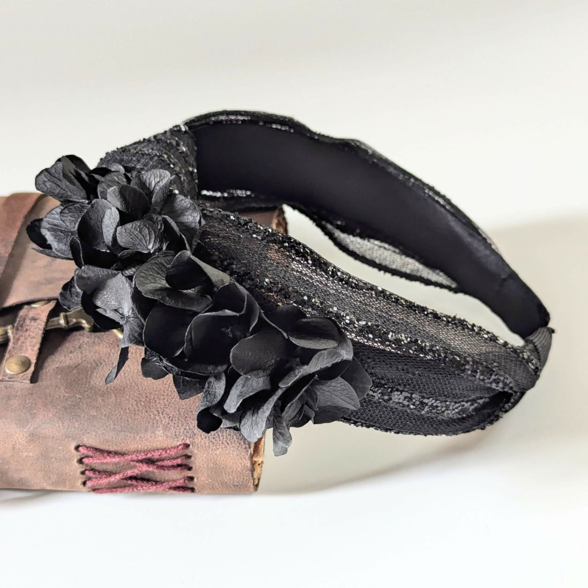Serre-tête artisanal orné d’hortensia stabilisé noir, Lolita
