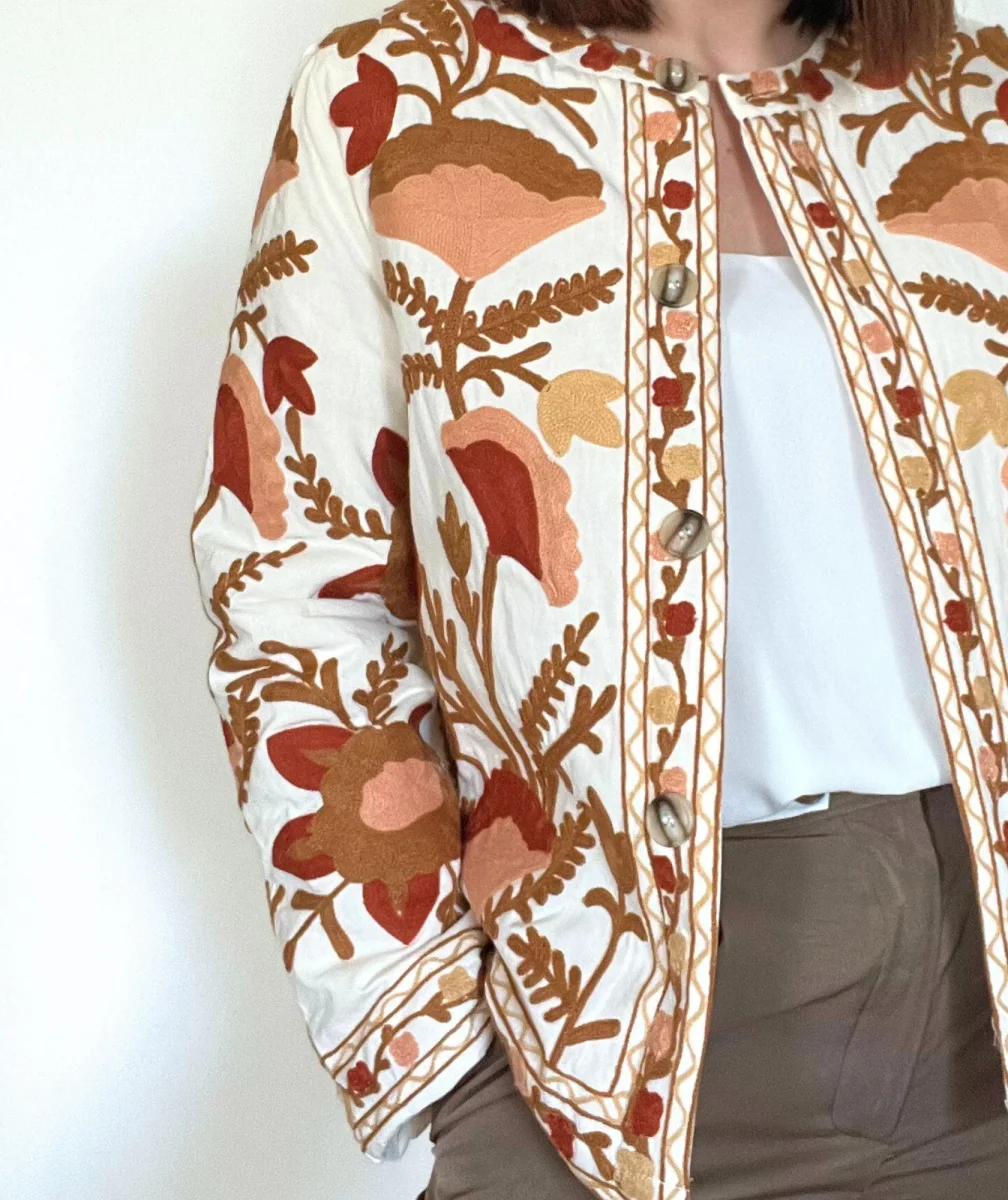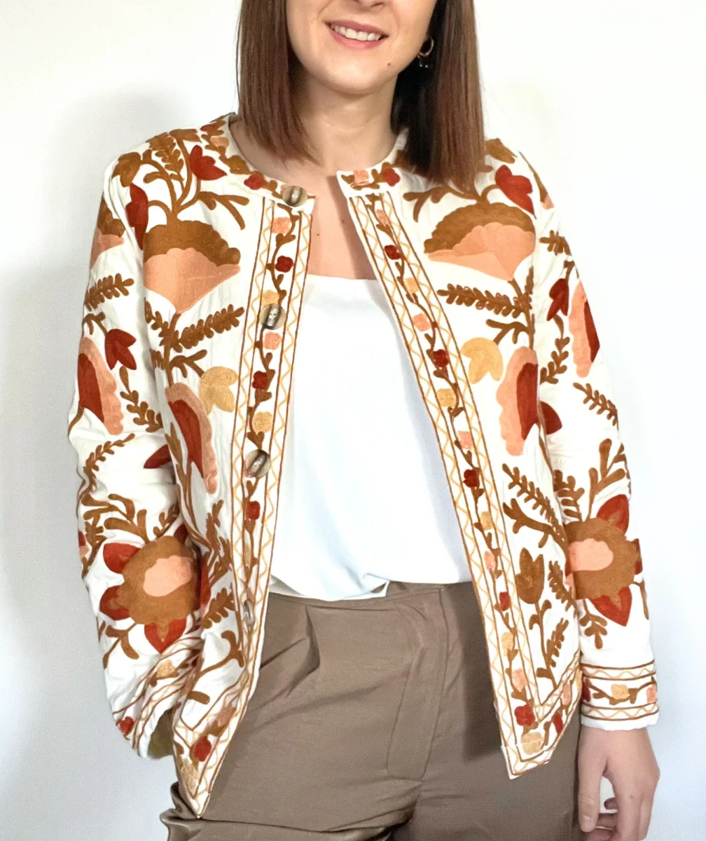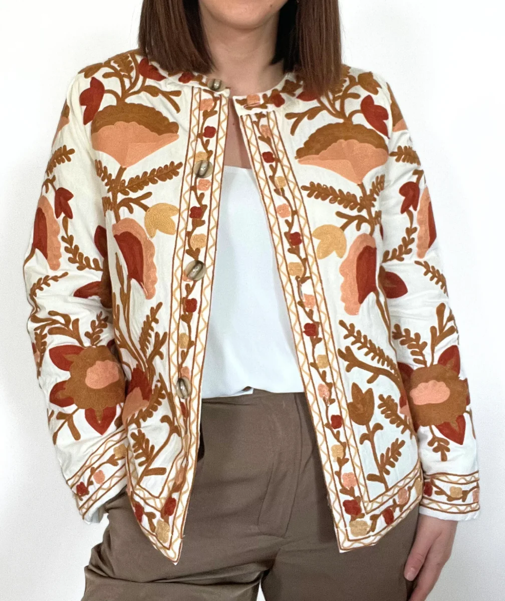 Sublimez votre style avec cette veste brodée bohème, un véritable bijou de raffinement et d’originalité. Confectionnée dans une matière douce et confortable, elle se distingue par ses somptueuses broderies florales aux nuances chaudes de marron, terracotta, orange et beige. Son col rond sans col, ses boutons élégants et sa coupe droite ajoutent une touche de sophistication à cette pièce intemporelle.