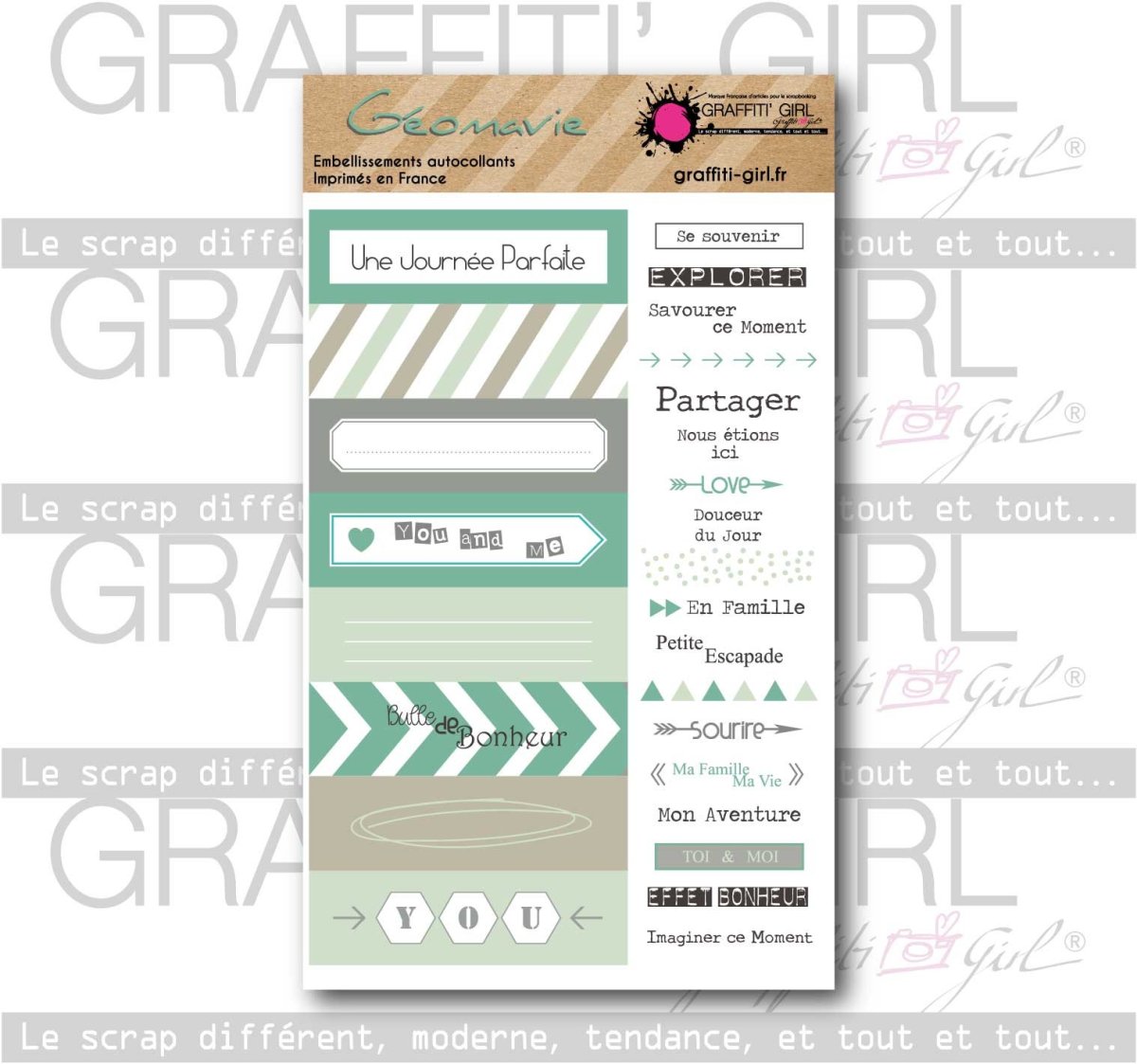 Cette planche de stickers scrapbooking Géomavie de la marque Graffiti Girl appartient à la collection Géomavie. Elle se compose de stickers de deux tailles différentes. Toujours dans le combo de couleurs bleu, gris et blanc, les stickers reprennent les codes géométriques et graphiques de la collection, utilisables facilement sur vos créations de scrapbooking. Cette planche de stickers Géomavie apparaît donc comme un indispensable dans vos projets de scrapbooking graphiques voir masculin.