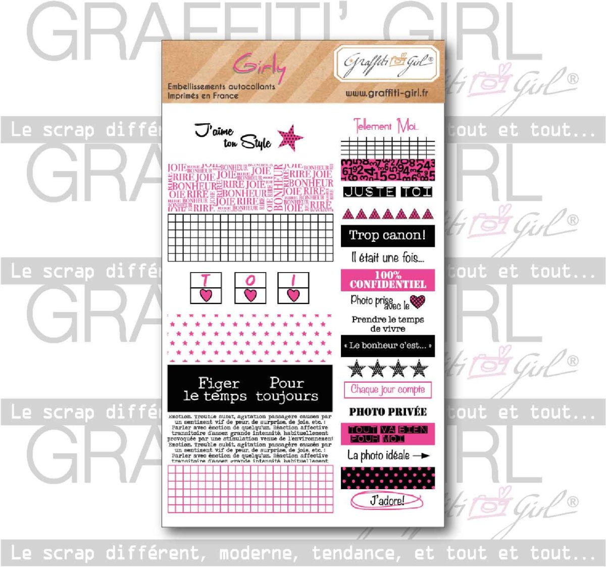 Cette planche de stickers scrapbooking Girly de la marque Graffiti Girl appartient à la collection Girly. la féminité est au rendez-vous pour vos pages de scrap avec les stickers Girly rose et noir. Les textes comme « 100% confidentiel » ou « Tellement moi » ajouteront du fun et du pétillant dans vos créations ! Cette planche de stickers Girly apparaît donc comme un indispensable dans vos projets de scrapbooking féminin et pétillant.