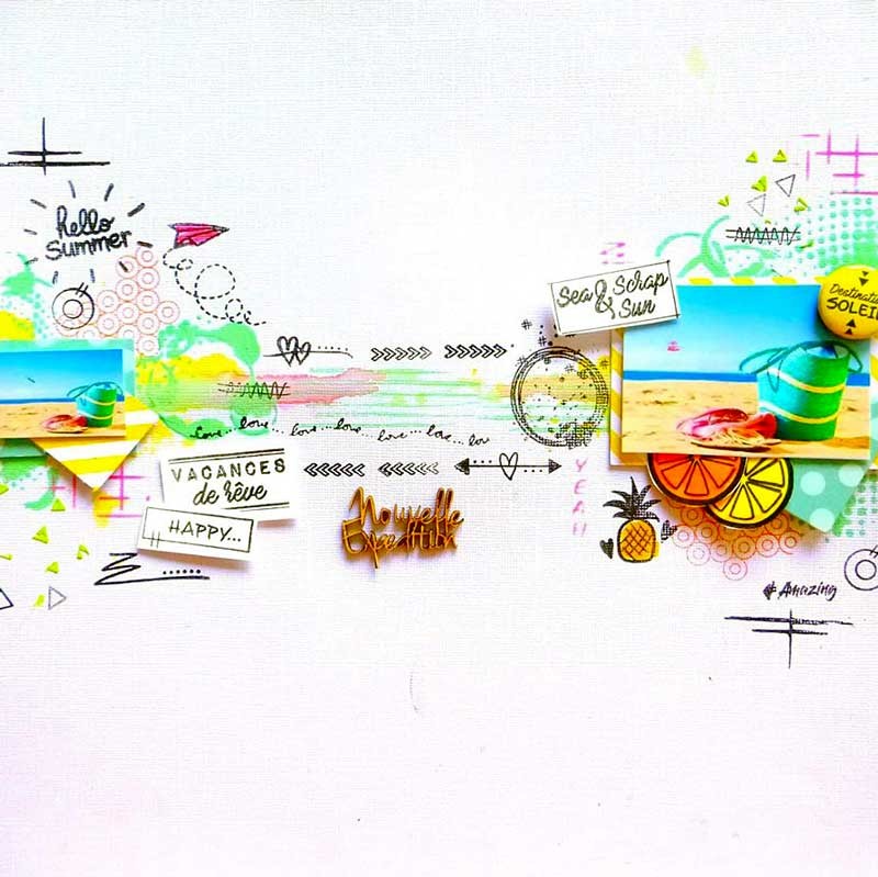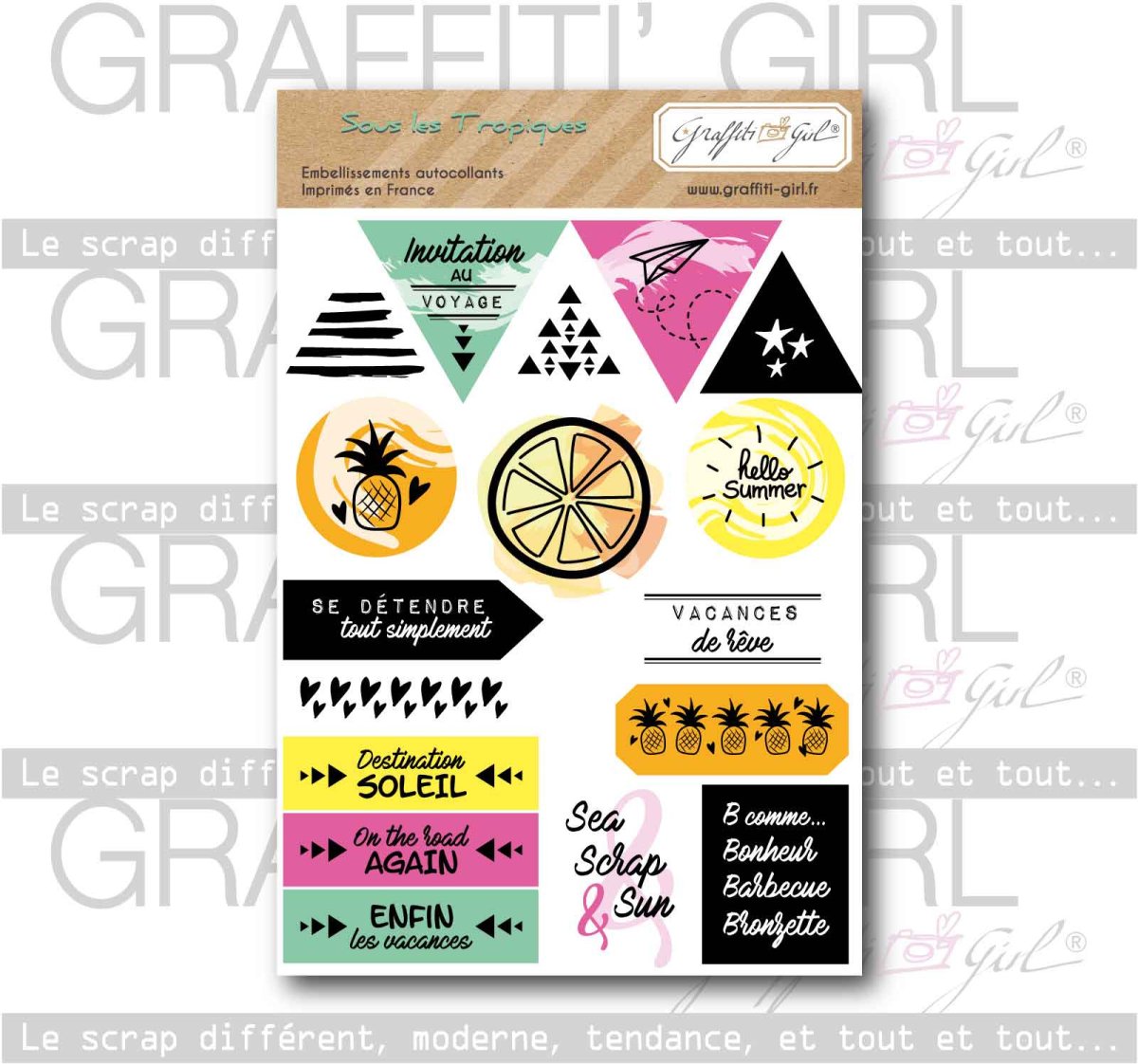 Cette planche de stickers scrapbooking Sous les tropiques de la marque Graffiti Girl appartient à la collection Sous les tropiques. Cette planche de stickers joyeuse dans des couleurs chaudes donnera de la vie à vos créations de scrapbooking. Et avec les différentes tailles de stickers, vous pouvez les utiliser pour une page de scrap, une carte de scrap ou autre projet créatif ! Cette planche de stickers Sous les tropiques apparaît donc comme un indispensable dans vos projets de scrapbooking en rapport avec l’été, les vacances, la mer.