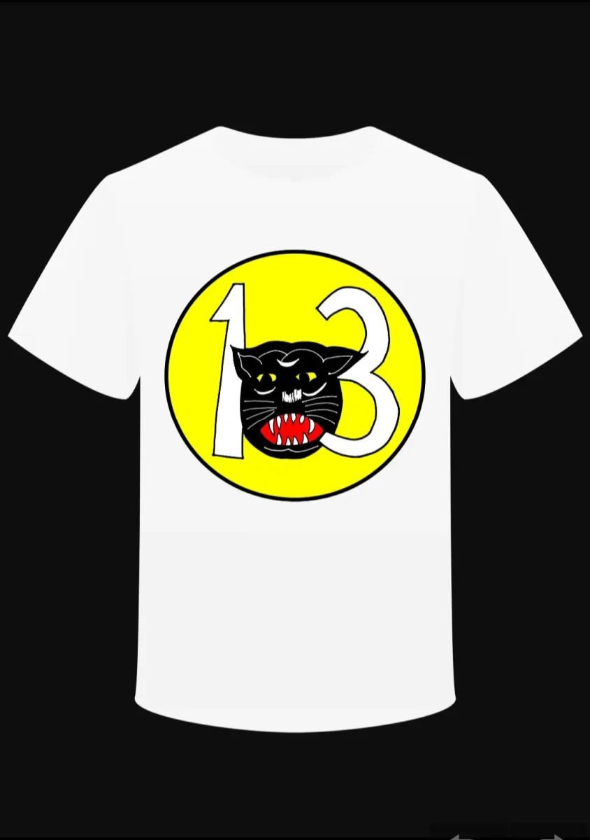 La boutique Punk & coton a retravaillé ce logo représentant une panthère noire au milieu du chiffre 13 qui rappelle l’histoire du destroyer de l’escadron 13 (Desron 13) de la marine américaine. Dessin repris du patch original V41 de l’escadron de destroyers de la marine américaine de la guerre du Vietnam 13 DESRON.
