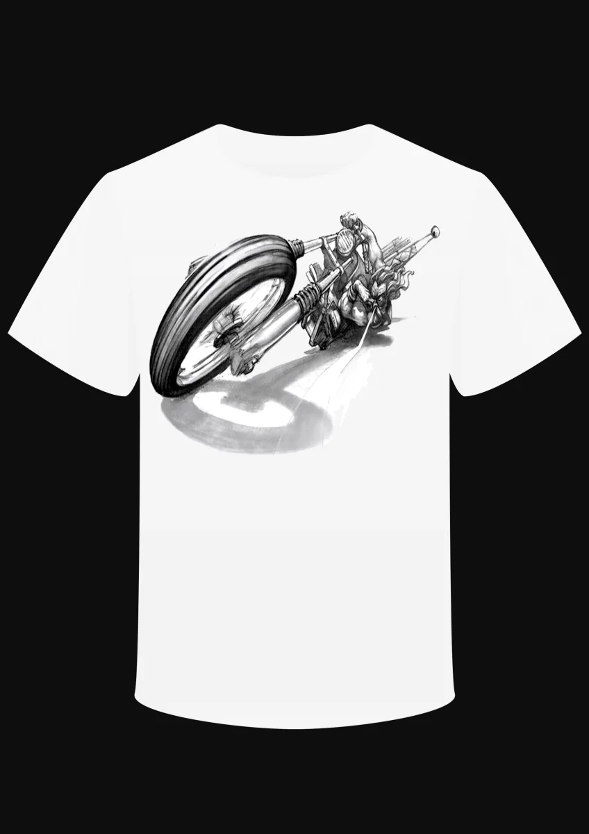 Rare design unknown drawing from 70’s about biker ridin and taking a line. Printed Back or Front printing. Rare design de dessin , origine inconnue des 70’s d’un biker roulant et sniffant. Impression Dos ou Devant