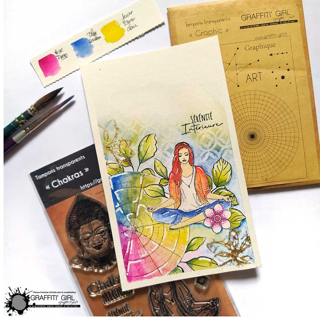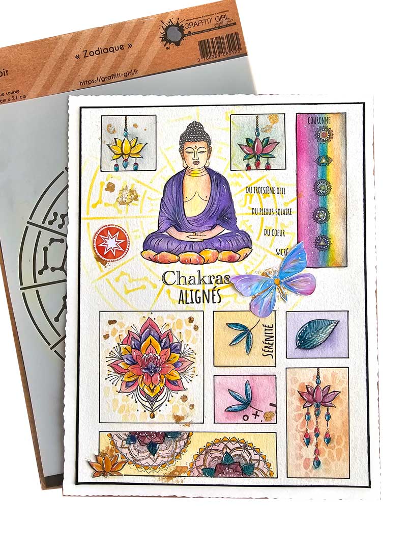 - Format : Planche A6 avec illustrations des sept chakras et une figure méditative.