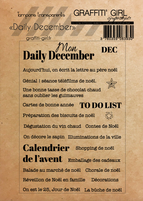 Nom: Daily December Produit: Tampons transparents Taille: A6 (9,6 cm x 14 cm) Marque: Graffiti Girl Collection: Noël givré Le petit plus: Vendu dans une pochette papier kraft recyclé, A6. Utilisation: A positionner sur un bloc acrylique (non fourni), encrez et appliquez. Nettoyage lingettes bébé ou chiffon humide.