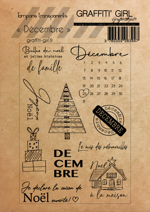 Nom: Décembre Produit: Tampons transparents Taille: A6 (9,6 cm x 14 cm) Marque: Graffiti Girl Collection: Noël givré Le petit plus: Vendu dans une pochette papier kraft recyclé, A6. Utilisation: A positionner sur un bloc acrylique (non fourni), encrez et appliquez. Nettoyage lingettes bébé ou chiffon humide.