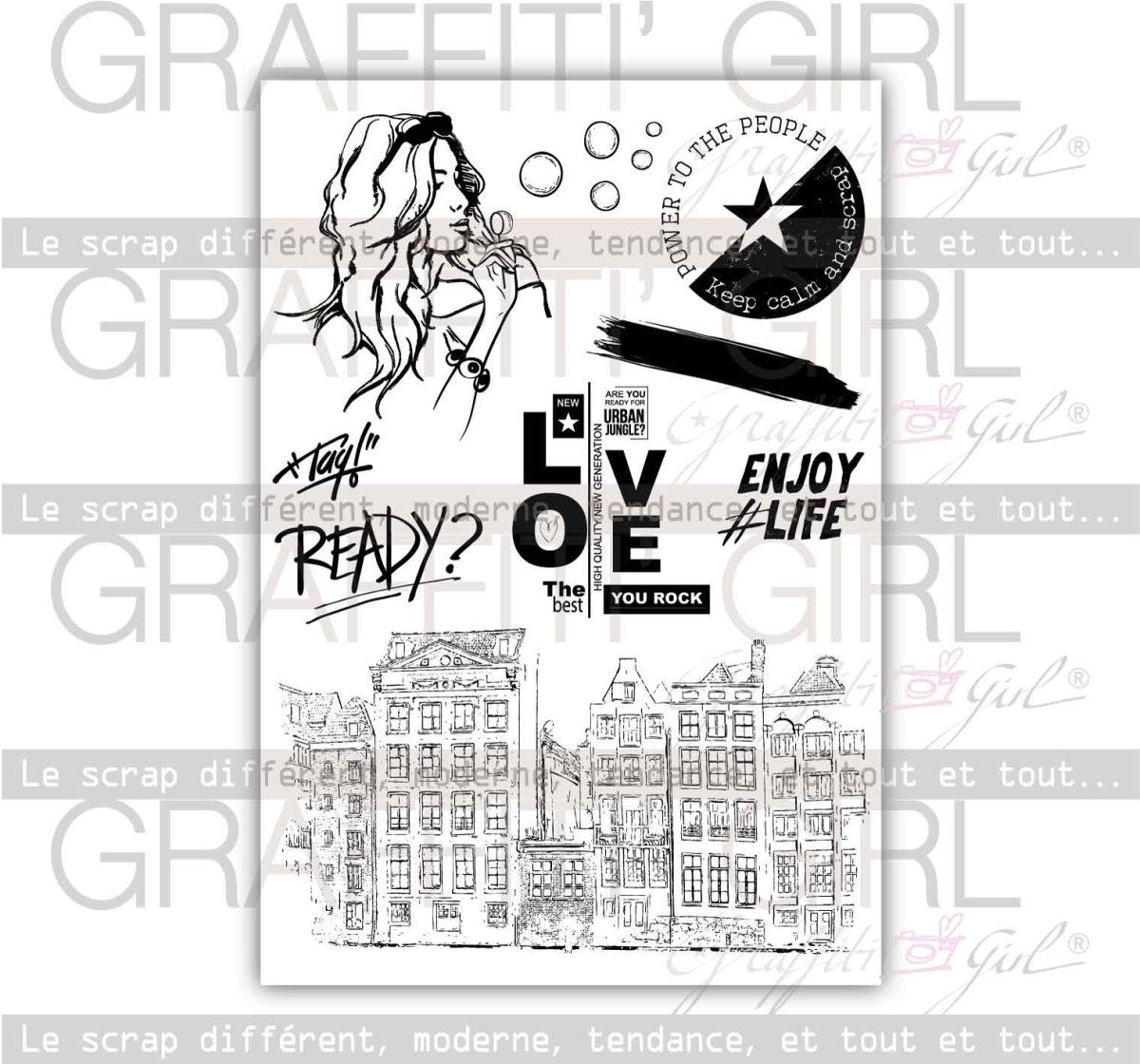 Tampons transparents modernes, dans un style urbain, fille fashion, la ville, pour un style de Scrapbooking très freestyle.