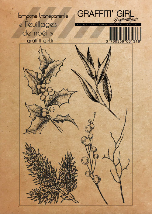Nom: Feuillages de Noël Produit: Tampons transparents Taille: A6 (9,6 cm x 14 cm) Marque: Graffiti Girl Le petit plus: Vendu dans une pochette papier kraft recyclé, A6. Utilisation: A positionner sur un bloc acrylique (non fourni), encrez et appliquez. Nettoyage lingettes bébé ou chiffon humide.
