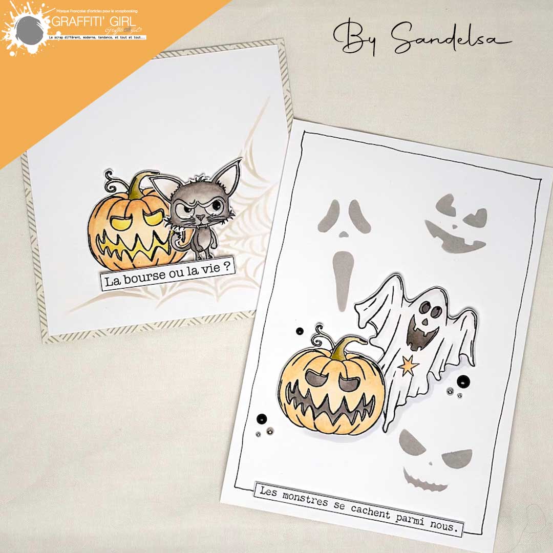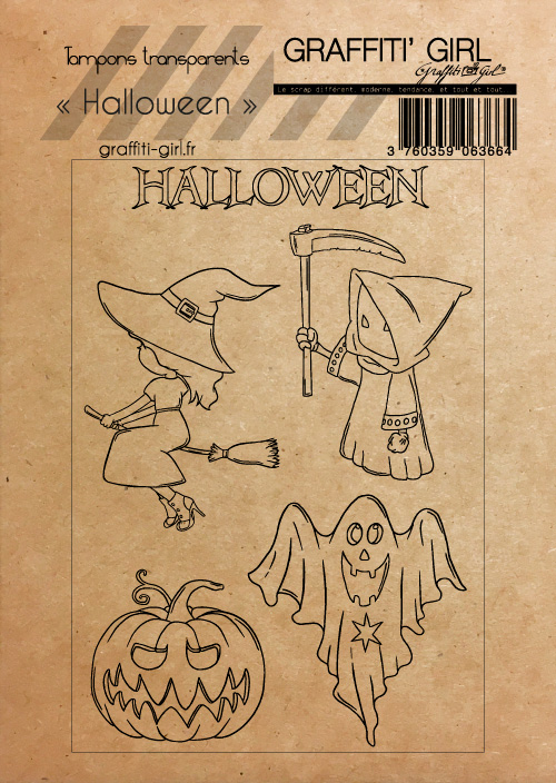 Nom: Halloween Produit: Tampons transparents Taille: A6 (9,6 cm x 14 cm) Marque: Graffiti Girl Collection: Halloween Le petit plus: Vendu dans une pochette papier kraft recyclé, A6. Utilisation: A positionner sur un bloc acrylique (non fourni), encrez et appliquez. Nettoyage lingettes bébé ou chiffon humide.