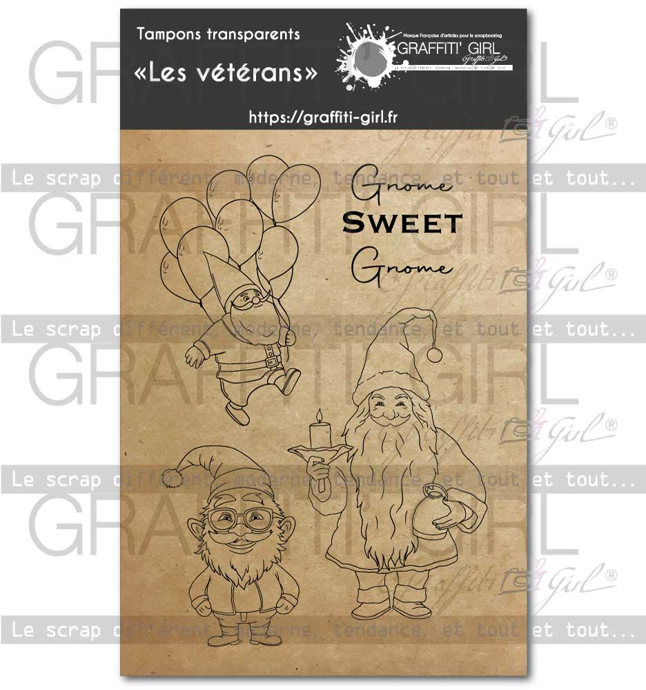 Nom: Les vétérans Produit: Tampons transparents Taille: A6 (9,6 cm x 14 cm) Marque: Graffiti Girl Collection: Noël enchanté Utilisation: A positionner sur un bloc acrylique (non fourni), encrez et appliquez. Nettoyage lingettes bébé ou chiffon humide.