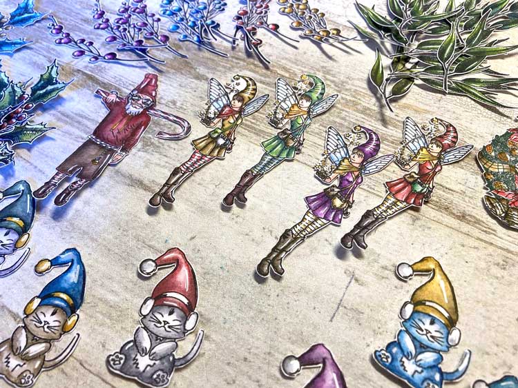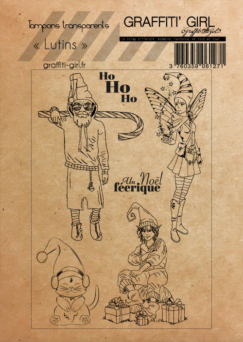 Un lutin canaille qui protège ses cadeaux, sans oublier l’adorable chaton et son cache oreille. Nous avons rajouté deux tampons texte pour agrémenter le tout.