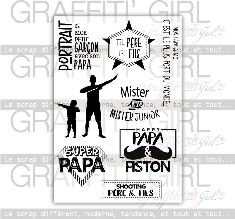Une planche de tampons scrapbooking en résine polymère. Cette planche de tampons sera parfaite pour tous les projets scrap avec des photos des papa et leur garçons. Tampons père et fils, une relation authentique et complice. des tampons adorable pour les papa et leur fiston.