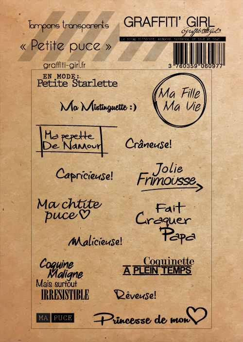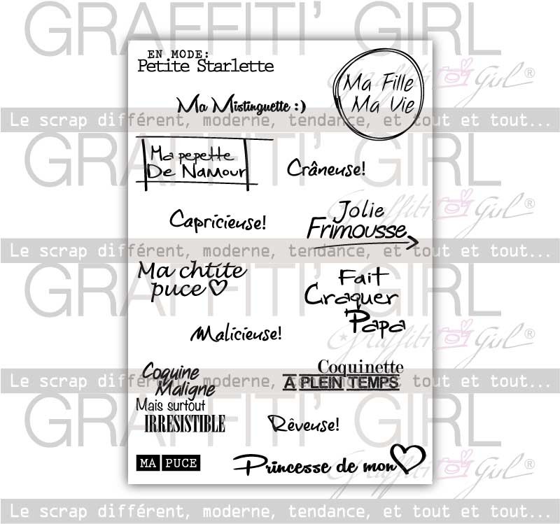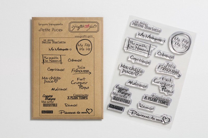 Planche de tampons scrap clears, avec des textes en français petite fille