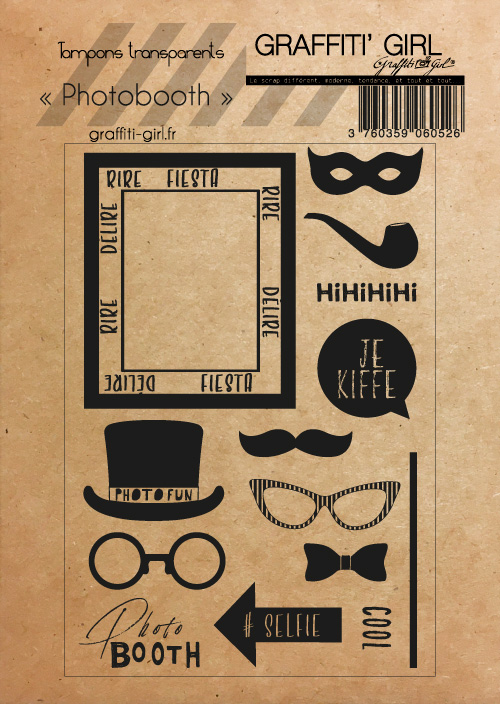 Nom: Photobooth Produit: Tampons transparents Taille: A6 (9,6 cm x 14 cm) Marque: Graffiti Girl Le petit plus: Vendu dans une pochette papier kraft recyclé, A6. Utilisation: A positionner sur un bloc acrylique (non fourni), encrez et appliquez. Nettoyage lingettes bébé ou chiffon humide.