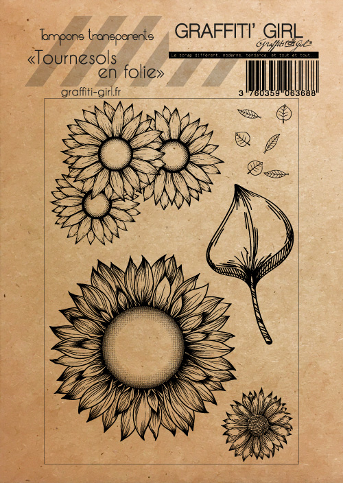 Nom: Tournesols en folie Produit: Tampons transparents Taille: A6 (9,6 cm x 14 cm) Marque: Graffiti Girl Collection: Cohérence Le petit plus: Vendu dans une pochette papier kraft recyclé, A6. Utilisation: A positionner sur un bloc acrylique (non fourni), encrez et appliquez. Nettoyage lingettes bébé ou chiffon humide.