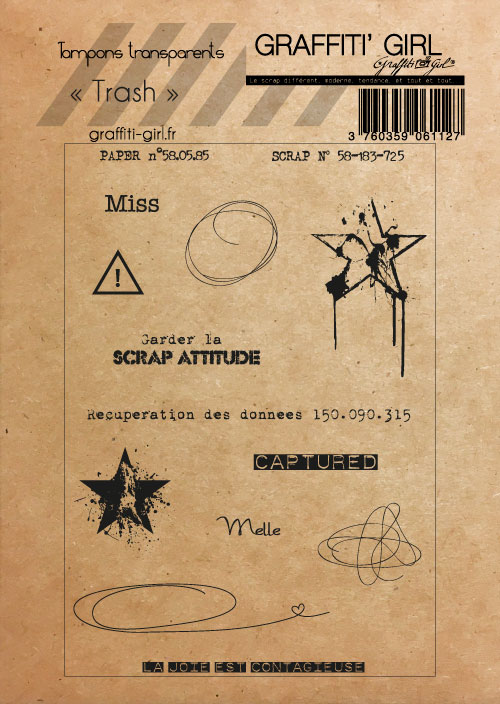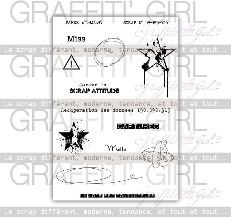 Cette planche de tampons scrapbooking Trash permet d’offrir à vos créations de scrap une touche plus freestyle. Laissez libre cours à votre imagination avec des traits fin et des pirouettes. Optez aussi pour un style grunge grâce au motifs étoilés que propose cette planche. Ce combo peut donc offrir une variété scrapesque avec des tampons textes comme la « scrap attitude » ou Miss.