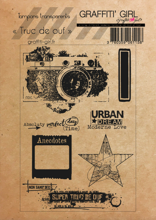 Nom: Truc de ouf Produit: Tampons transparents Taille: A6 (9,6 cm x 14 cm) Marque: Graffiti Girl Le petit plus: Vendu dans une pochette papier kraft recyclé, A6. Utilisation: A positionner sur un bloc acrylique (non fourni), encrez et appliquez. Nettoyage lingettes bébé ou chiffon humide.