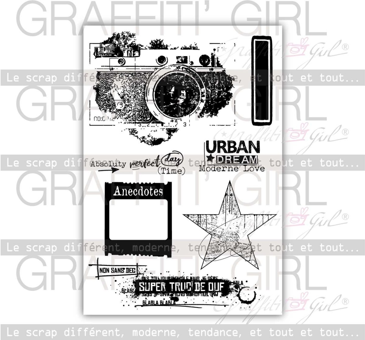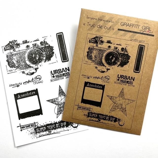 Des tampons décalés, grunges, esprit abstrait, dans un style qu’on adore chez Graffiti Girl, du sublime appareil photo à l’aspect d’encre, l’étoile , la diapositive, chaque motif à un lien, dans le style de l’autre.
