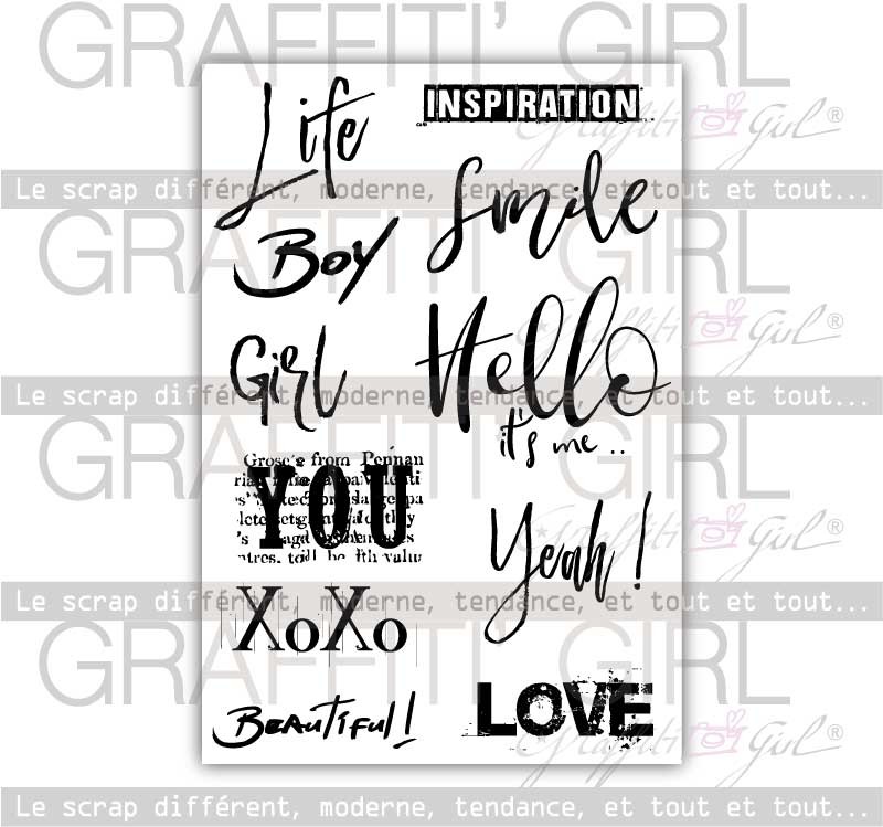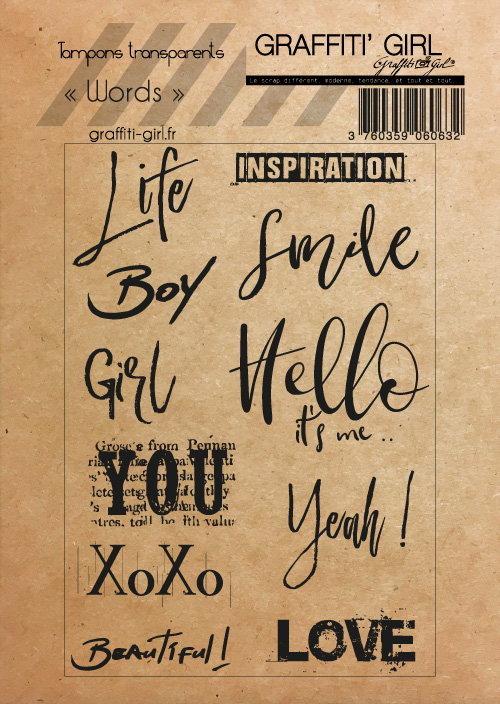 Nom: Words Produit: Tampons transparents Taille: A6 (9,6 cm x 14 cm) Marque: Graffiti Girl Le petit plus: Vendu dans une pochette papier kraft recyclé, A6. Utilisation: A positionner sur un bloc acrylique (non fourni), encrez et appliquez. Nettoyage lingettes bébé ou chiffon humide.