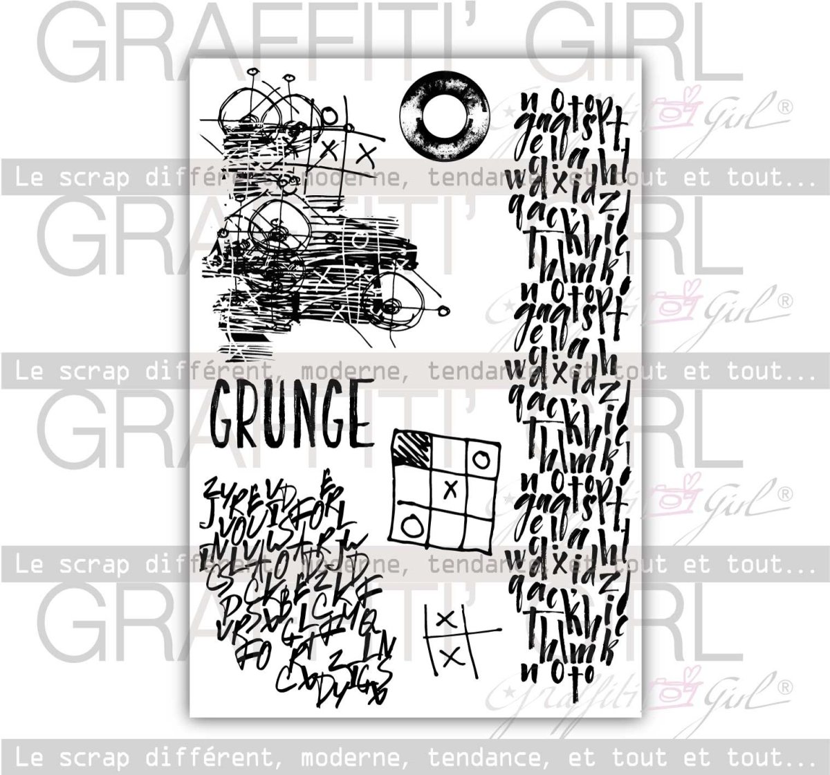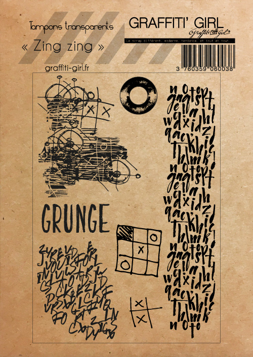 Zing Zing comme son nom cette planche de tampons transparents est décalée et offre des possibilités d’art journal, mais également utilisables en clans, ces tampons sont top pour réaliser des fonds de scrap, les tampons alphabets servent de textures de scrap. un oeillet, le mot grunge, des tampons gribouillis, designs abstraits.