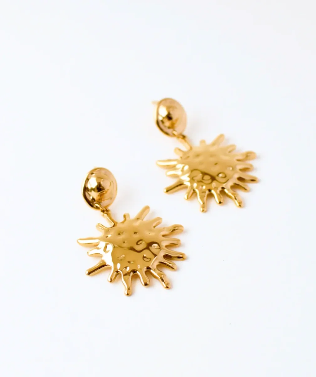 Rayonnez au quotidien avec ces boucles d’oreilles dorées en forme de soleil. Leur design et leur texture attirent naturellement la lumière, apportant éclat et caractère à votre tenue. Elles ne noircissent pas, ne craignent pas l’eau et restent légères à porter. Une paire forte, parfaite pour illuminer vos looks d’hiver comme d’été.