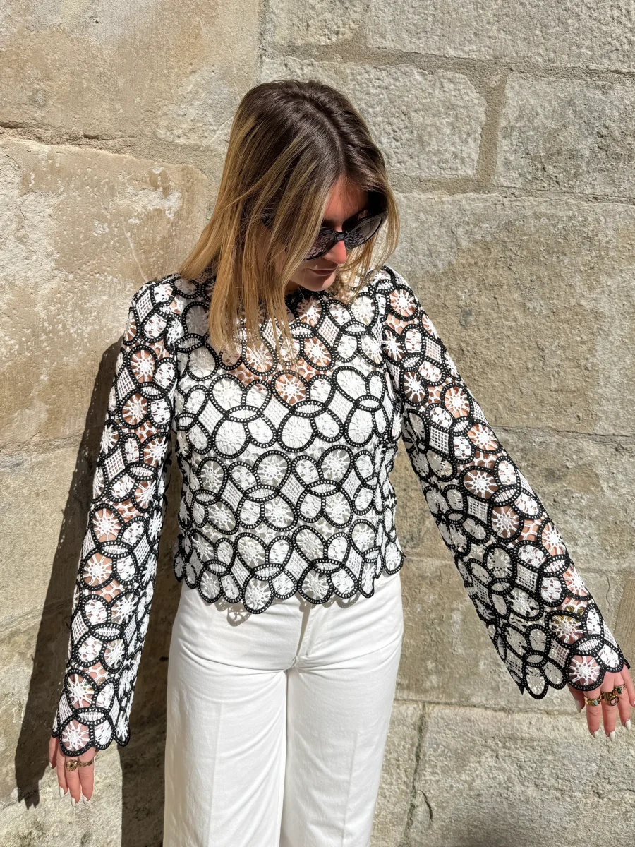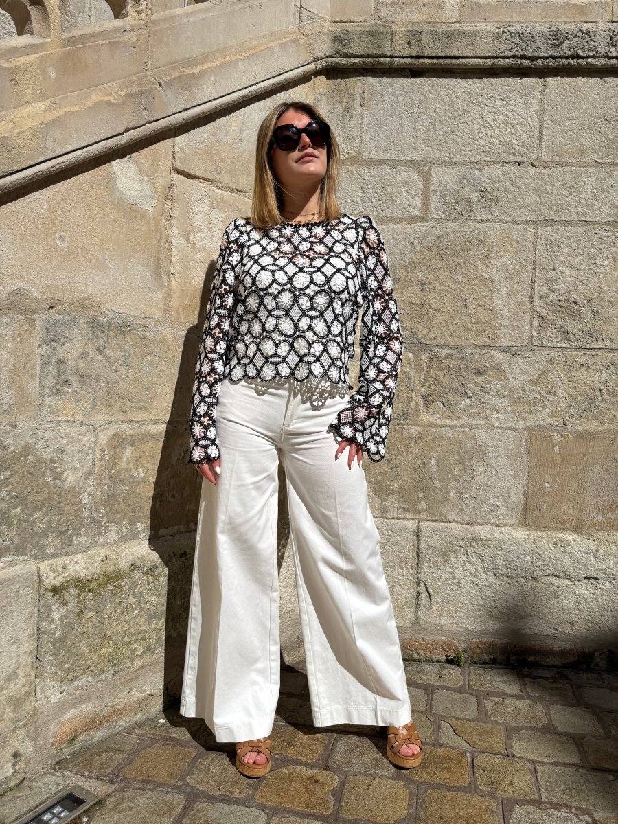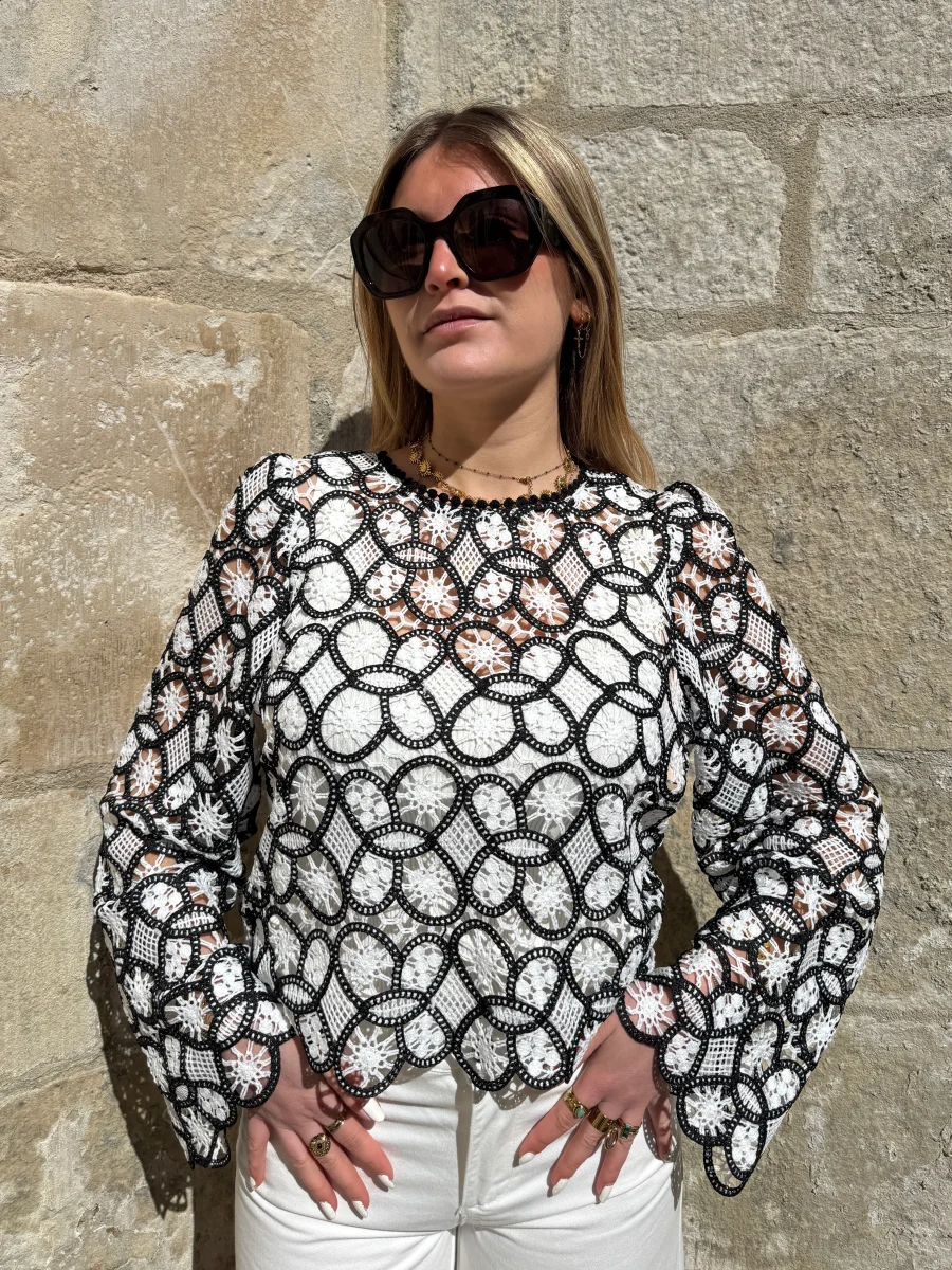 Ce top ajouré blanc et noir est à retrouver dans votre boutique De La Mode la Rochelle.