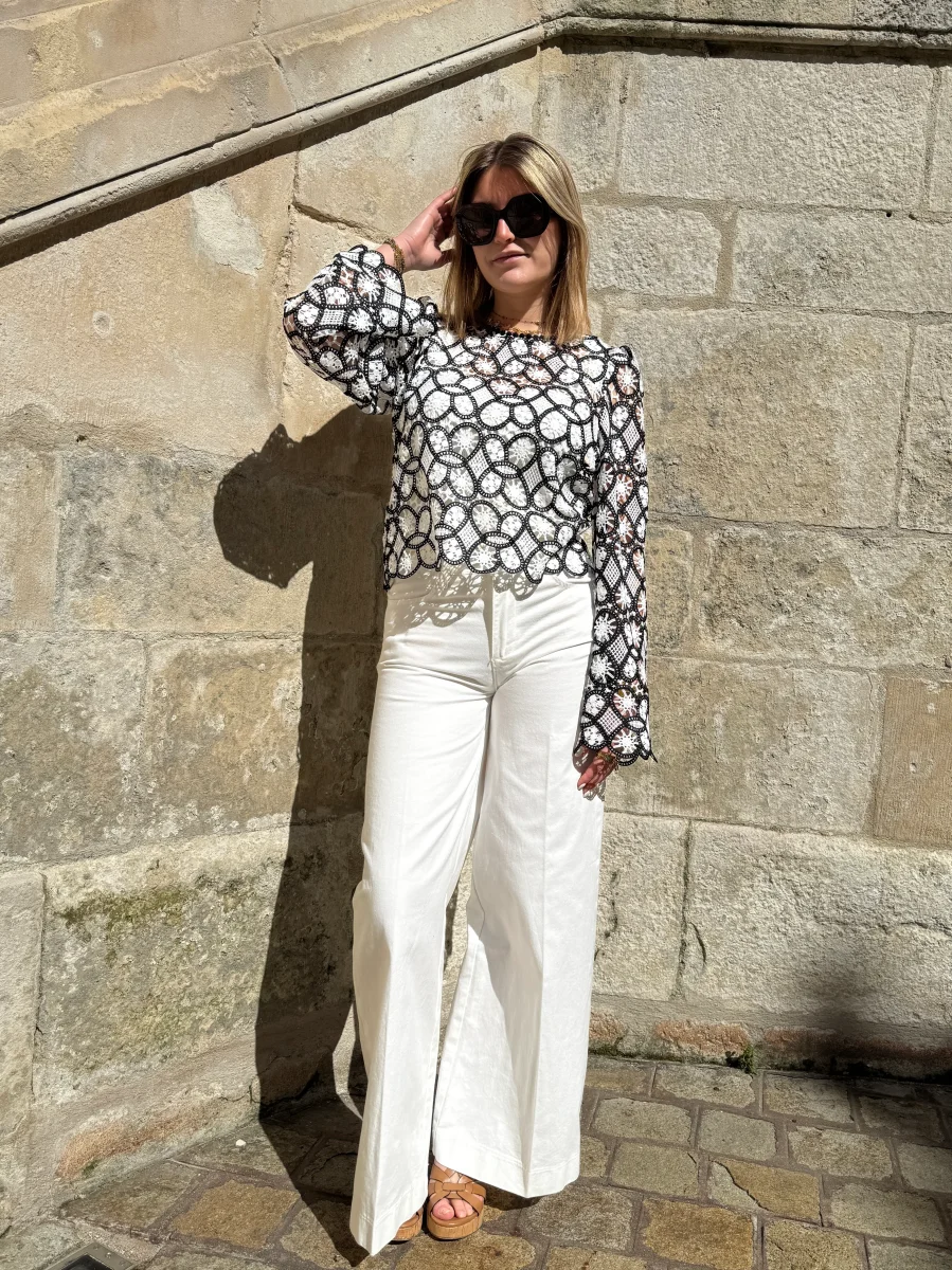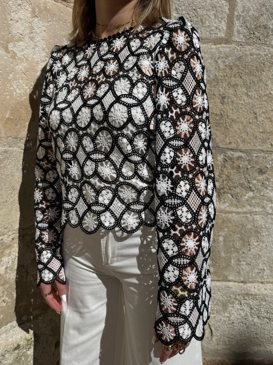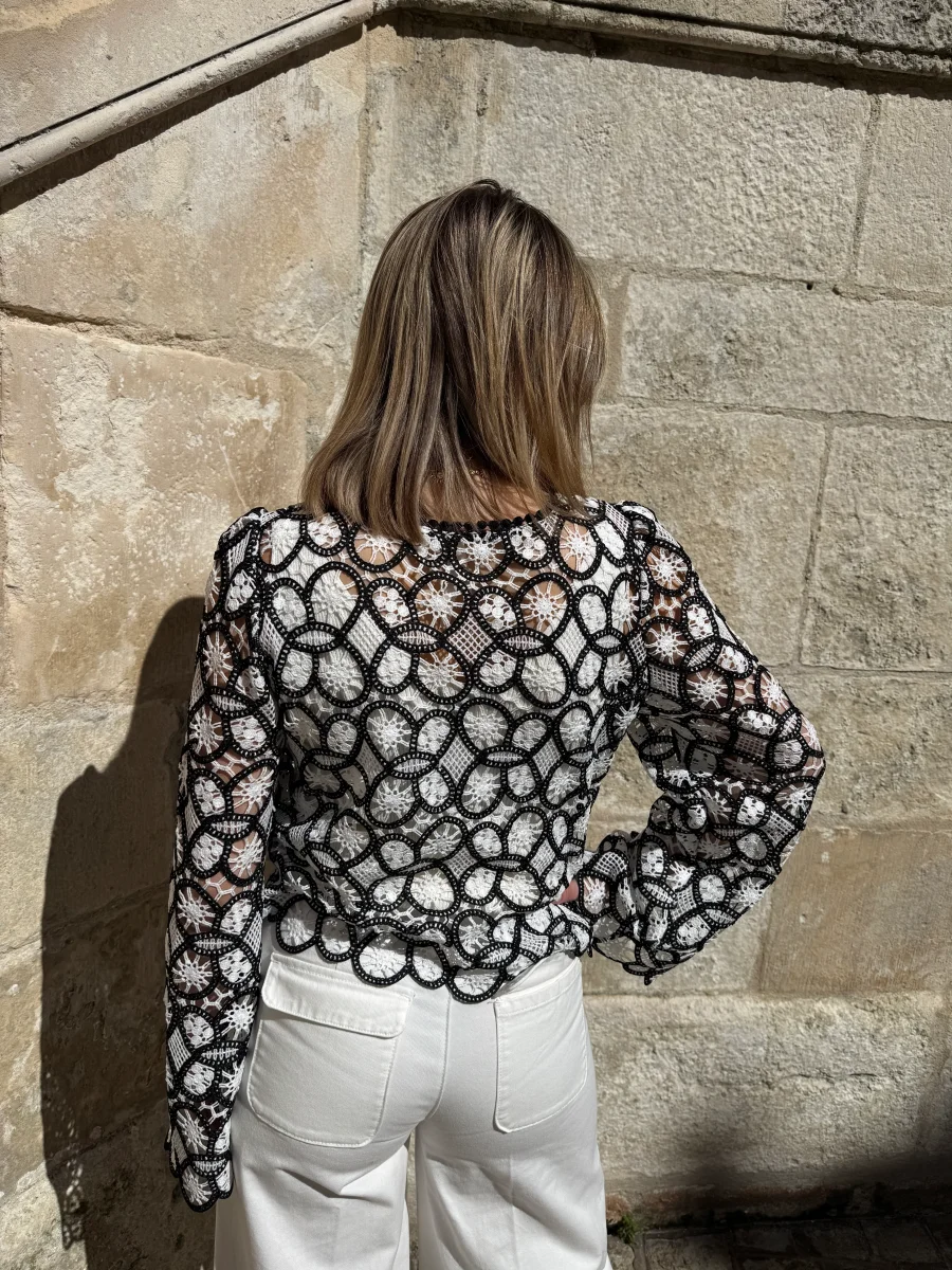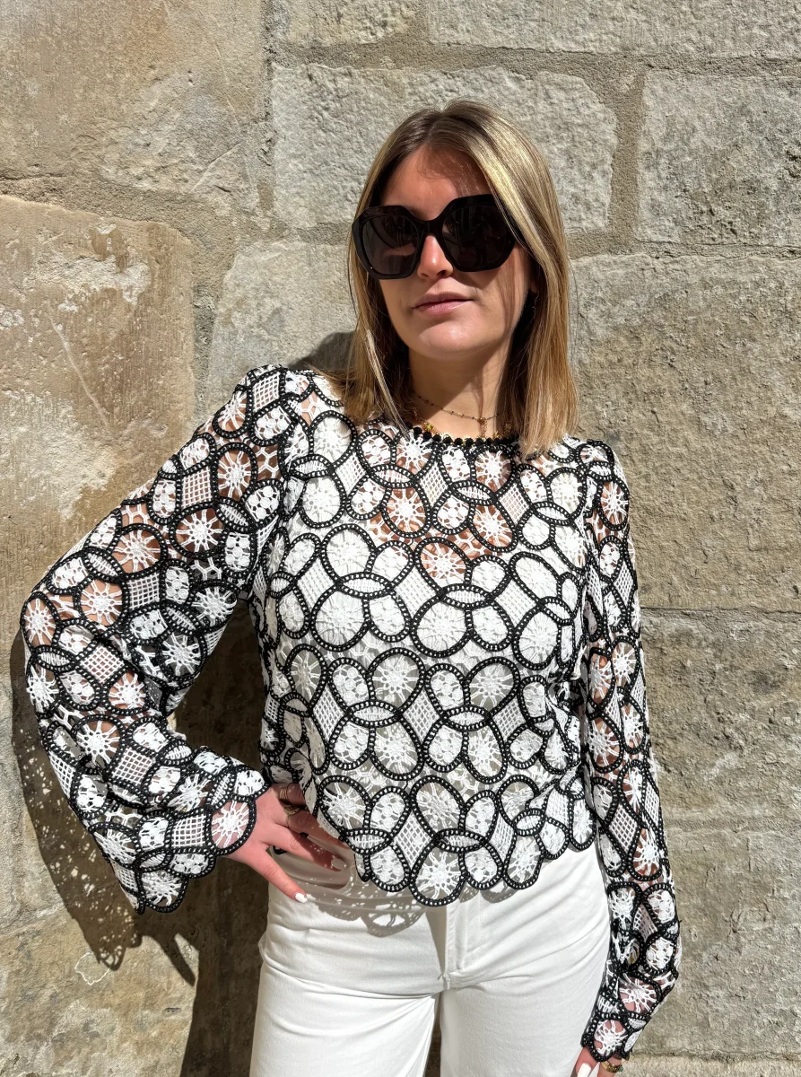 Ce top ajouré blanc et noir est à retrouver dans votre boutique De La Mode la Rochelle.