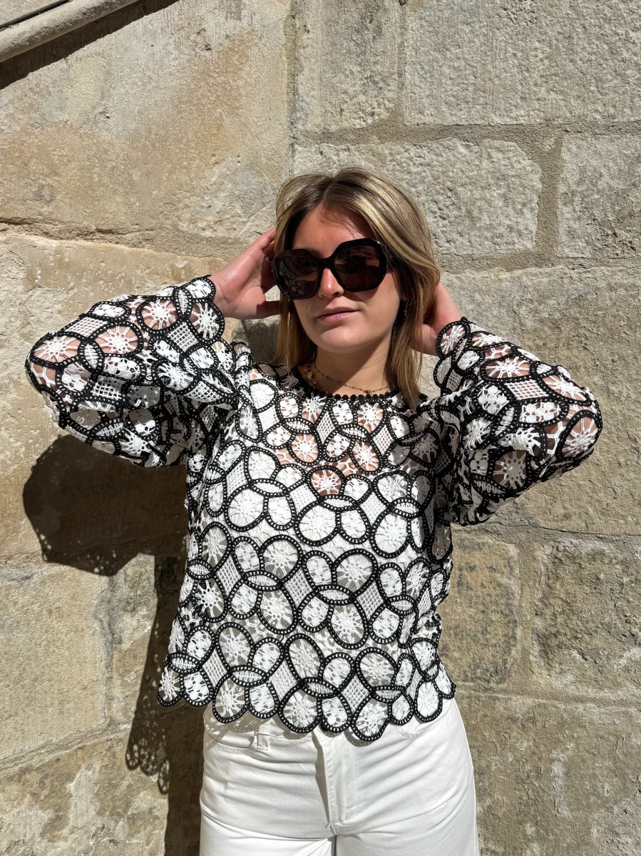 Le top AELA est une pièce élégante et raffinée, parfaite pour apporter une touche de sophistication à votre tenue. Confectionné en 100% polyester, il offre une texture fluide et agréable à porter. Son col rond délicat est sublimé par de fines broderies ajourées noires et blanches, apportant un contraste élégant et un charme unique.