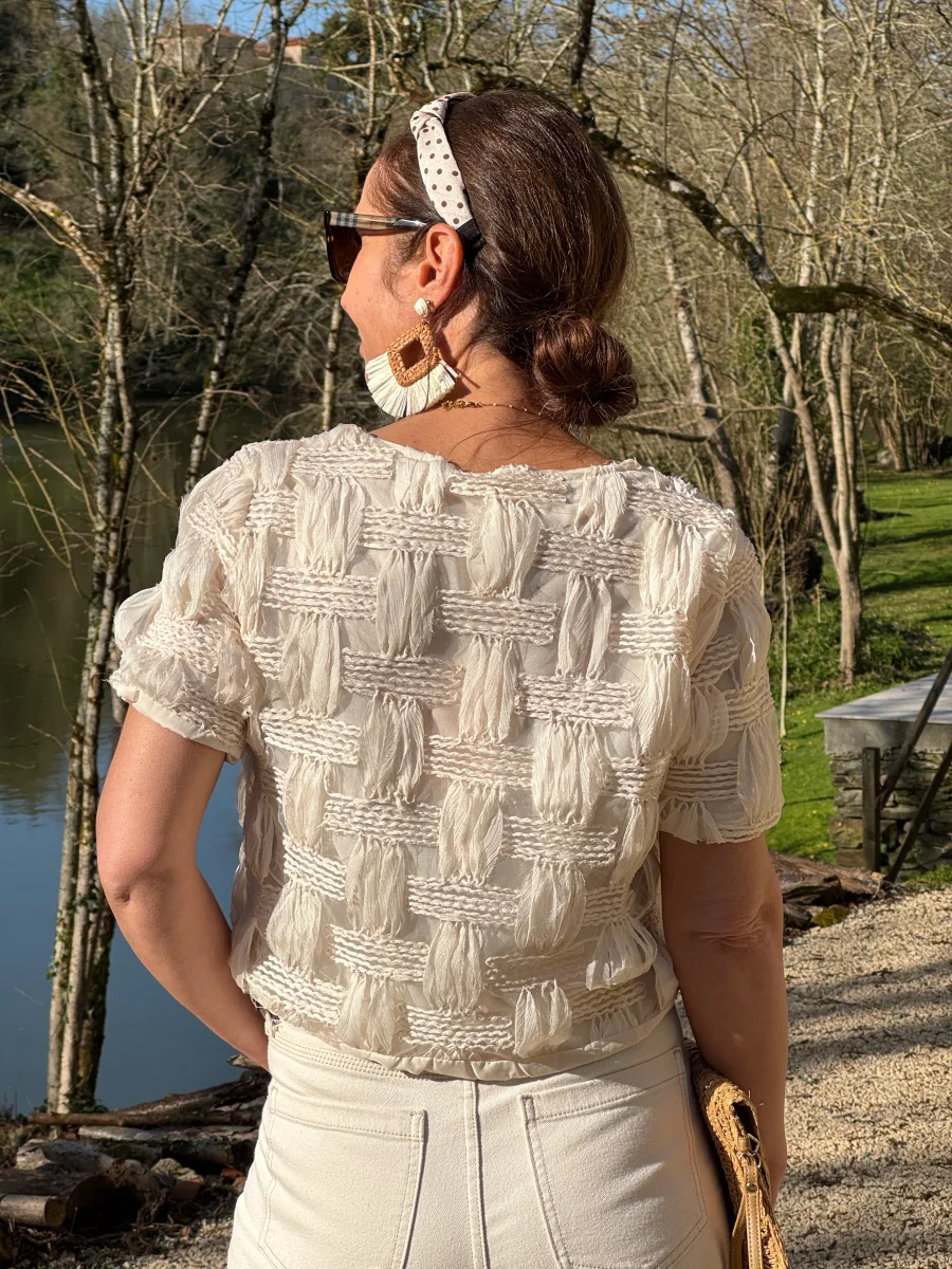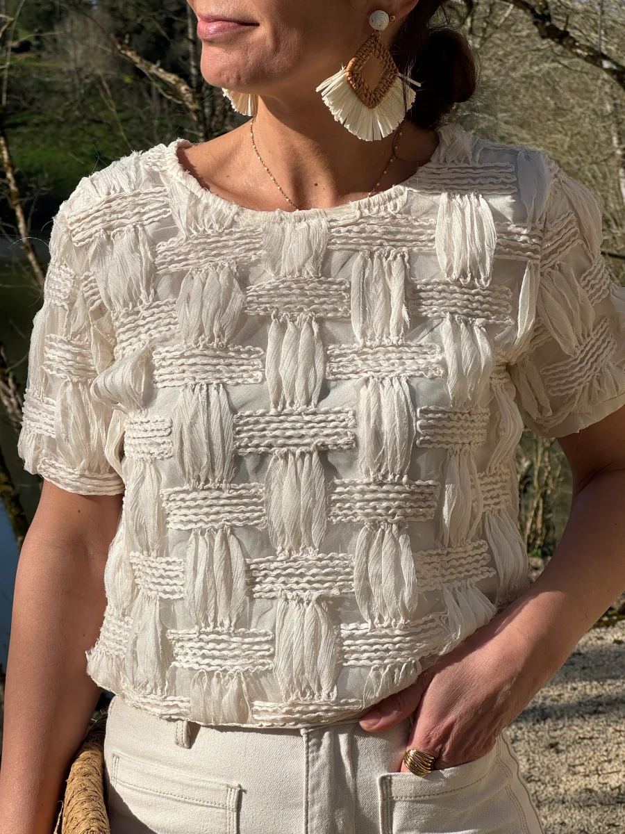 Top beige broderie quadrillage ALBA