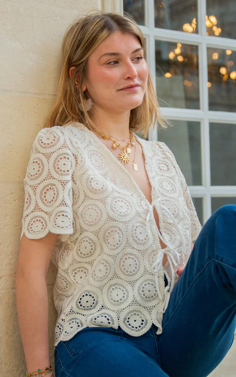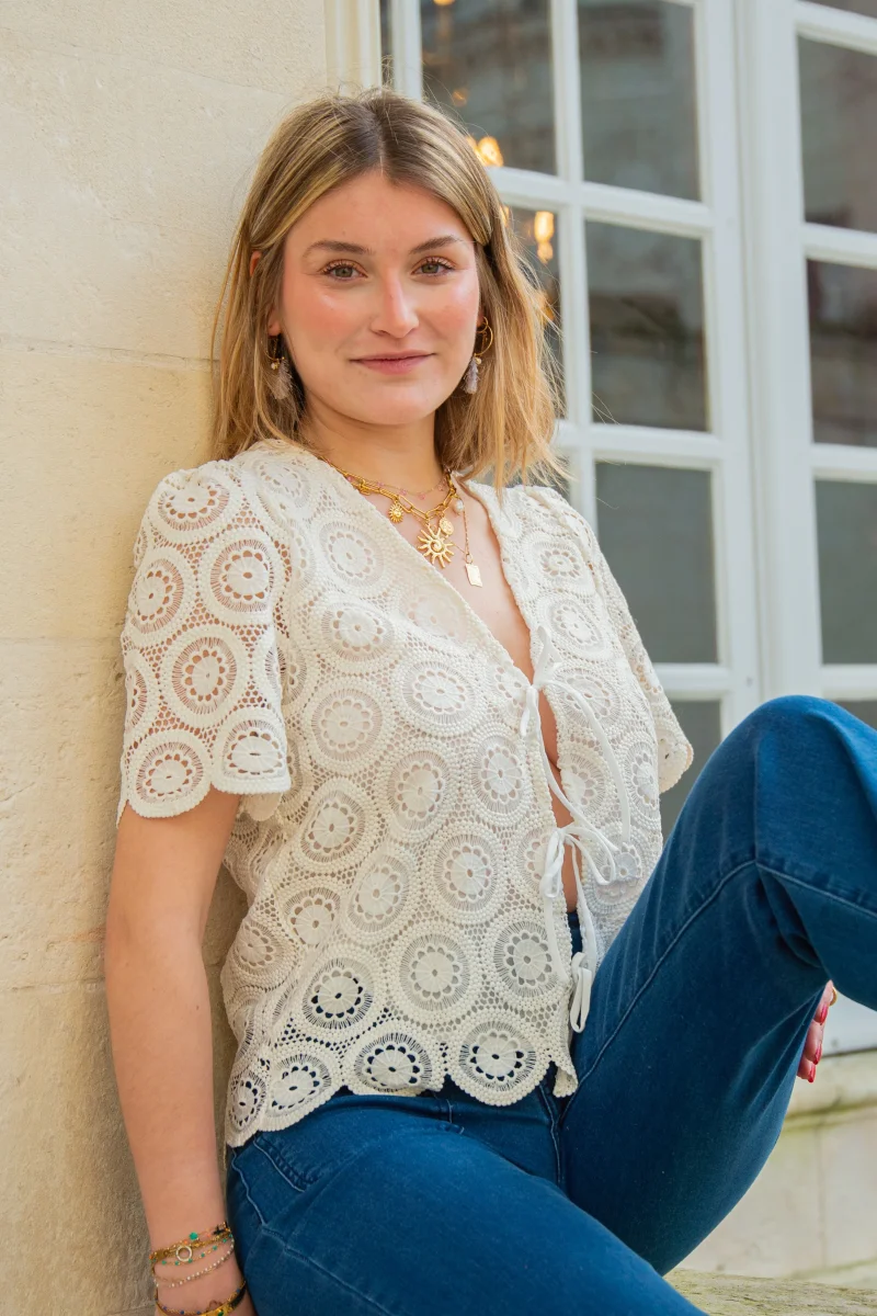 Retrouvez ce top en broderie anglaise à noeud écru signée La Petite Étoile dans votre boutique De La Mode la Rochelle.