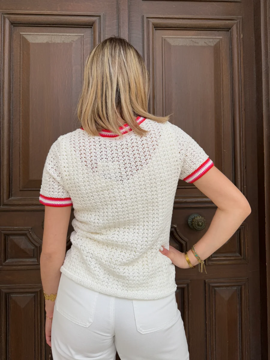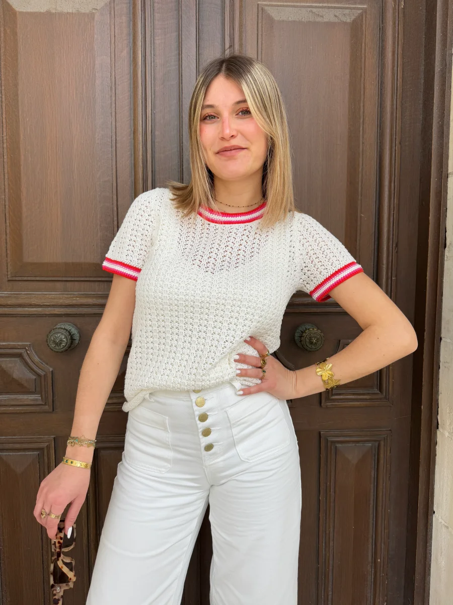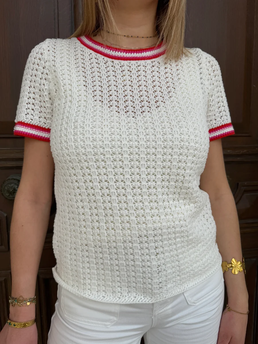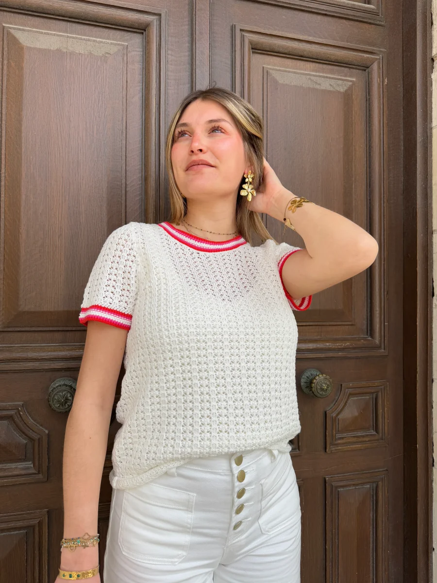 Le top MASON de la marque La Petite Étoile est une pièce estivale pleine de fraîcheur, idéale pour apporter une touche de couleur à votre dressing. Confectionné en maille ajourée 100% coton, il offre une sensation de légèreté et de confort tout au long de la journée. Son coloris écru, rehaussé de détails fuchsia et rouge au niveau du col rond et des manches courtes, lui confère un style moderne et lumineux. Sa coupe droite s’adapte à toutes les morphologies et assure un tombé parfait. Le logo doré « LPE » discrètement apposé sur un médaillon gravé en bas du modèle ajoute une finition élégante et discrète. Ce top ajouré est parfait pour composer un look tendance et casual, aussi bien avec un short en denim qu’un pantalon fluide.
