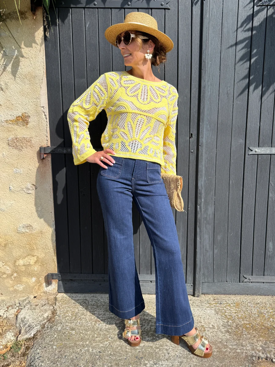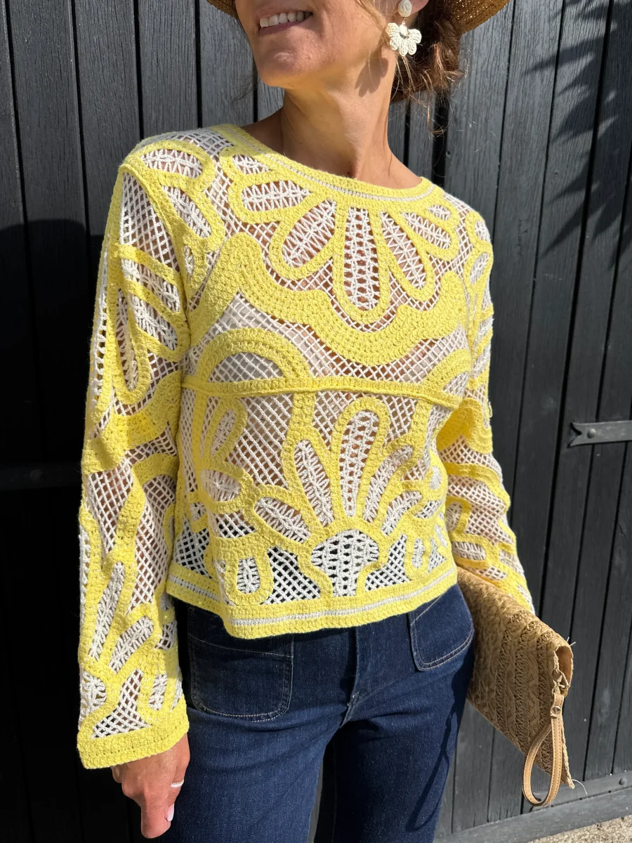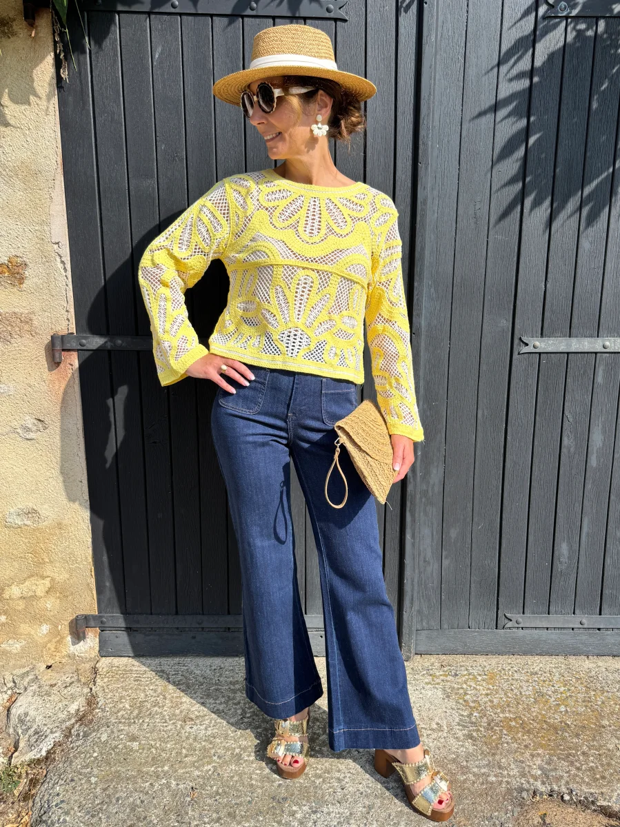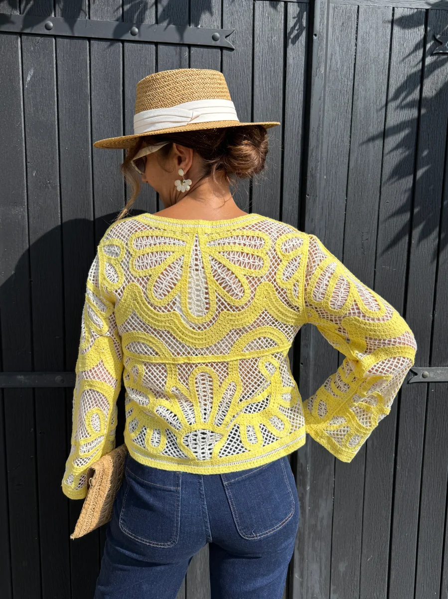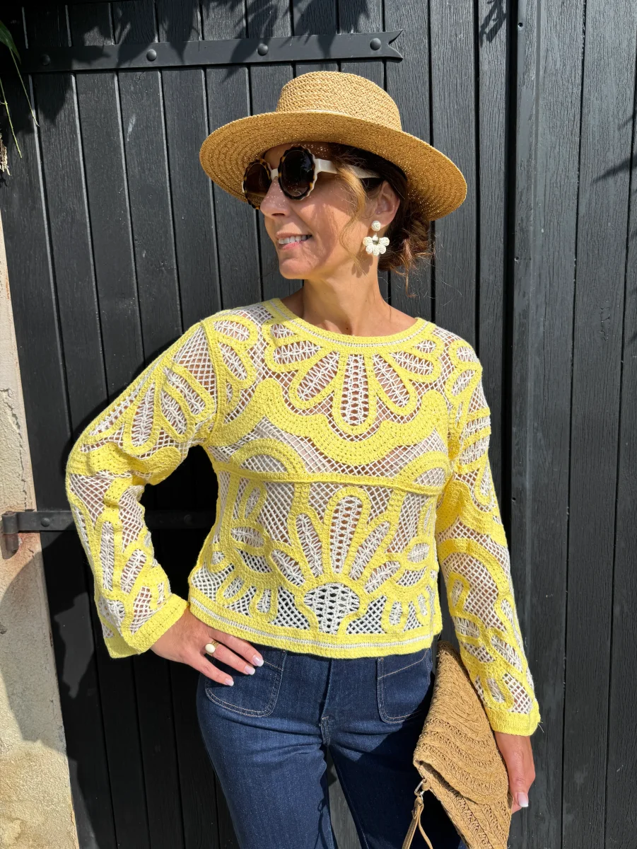 Retrouvez ce top en crochet jaune et écru à manches longues dans votre boutique De La Mode la Rochelle.