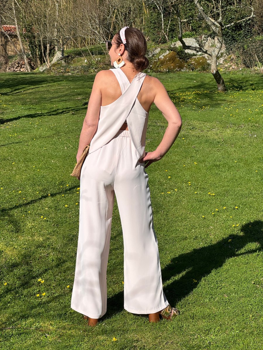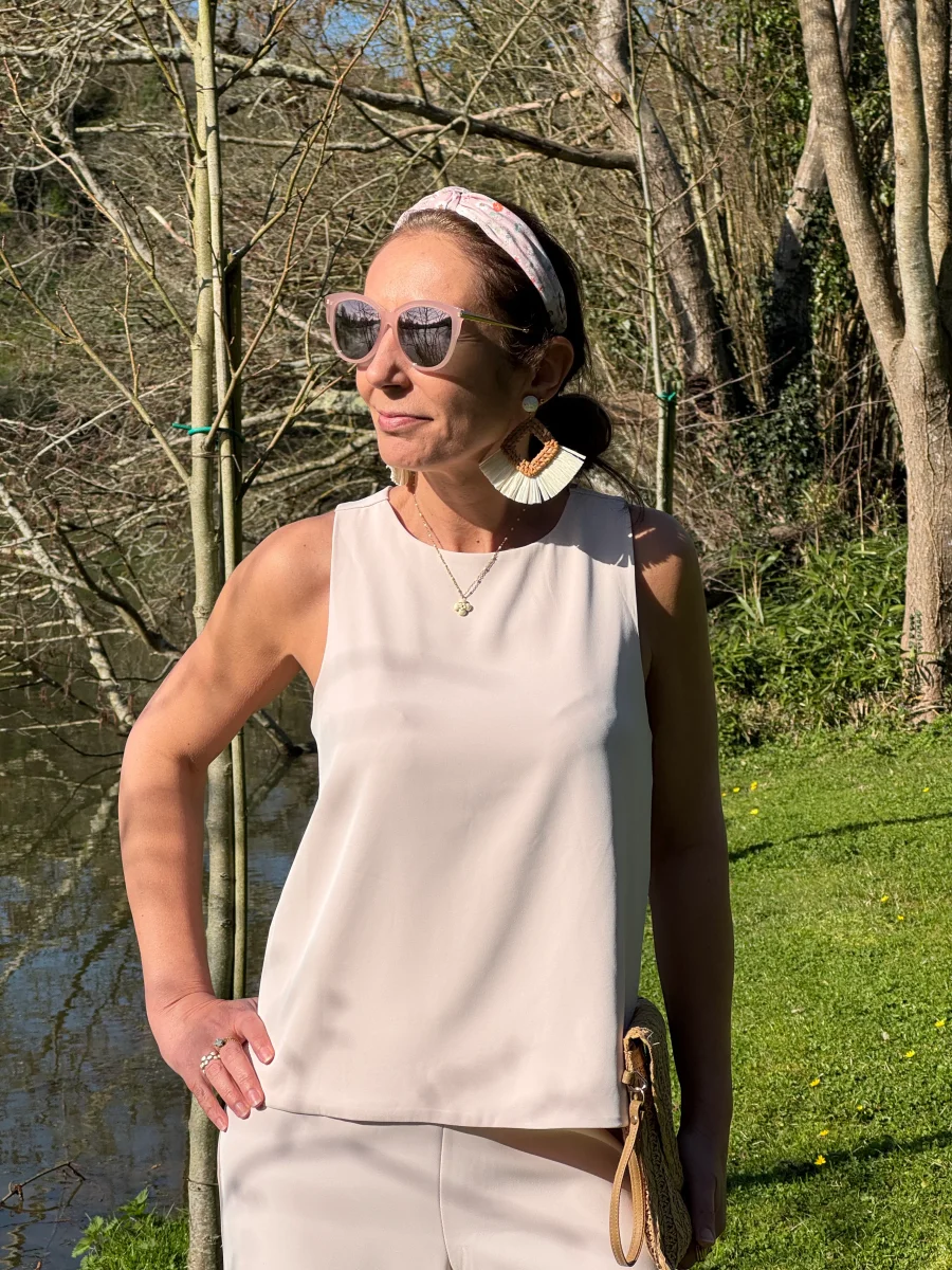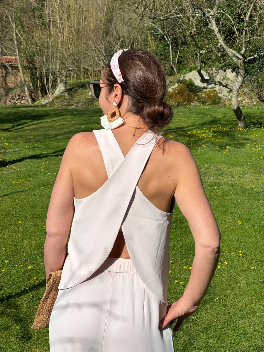 Ce top sans manches se distingue par son col rond à l’avant, offrant une allure épurée et raffinée. Le dos dévoile un décolleté élégant, sublimé par un effet croisé dans le dos qui apporte modernité et originalité.