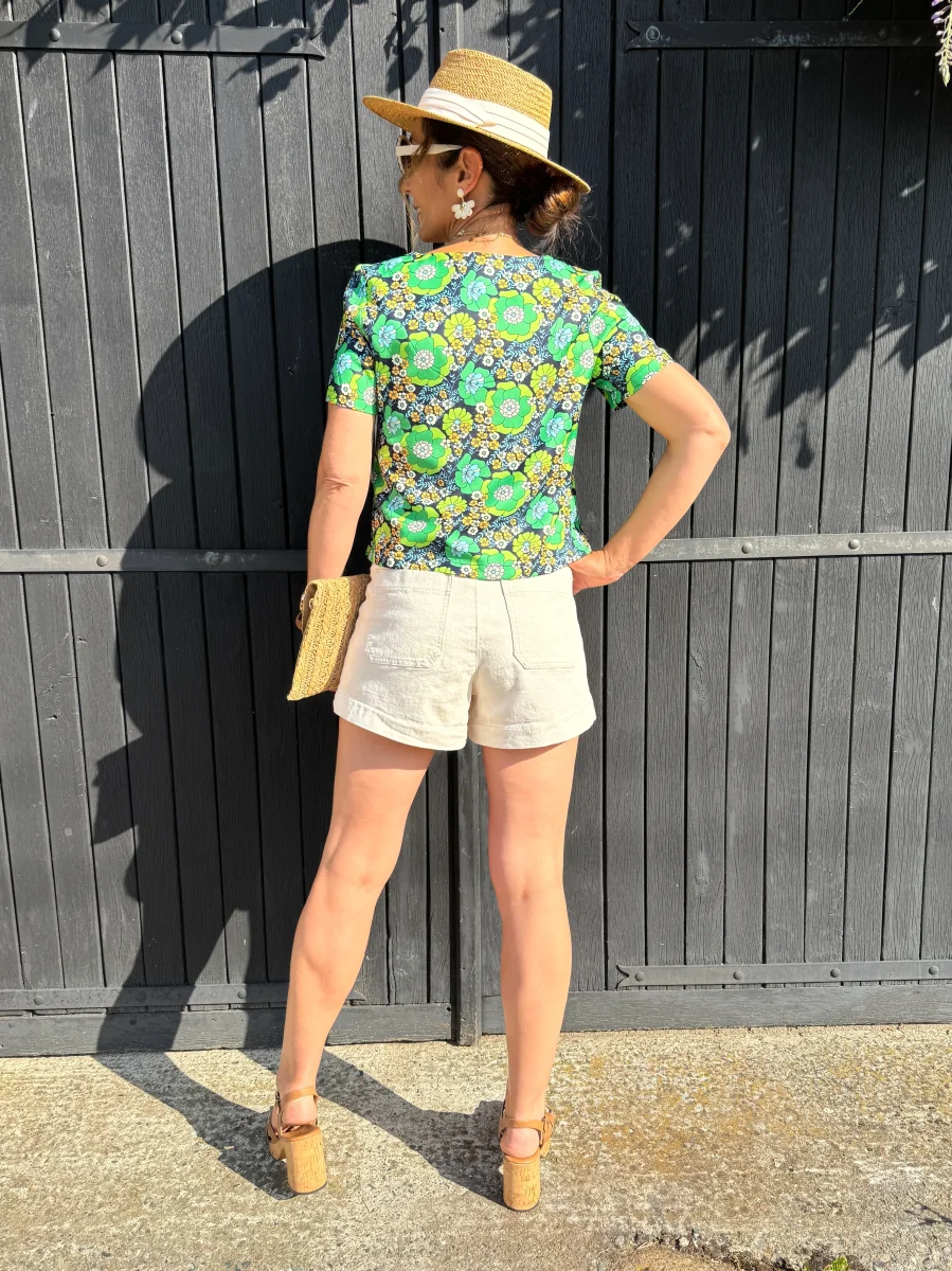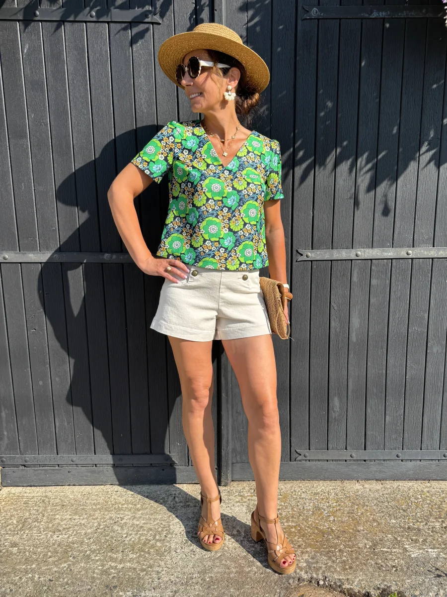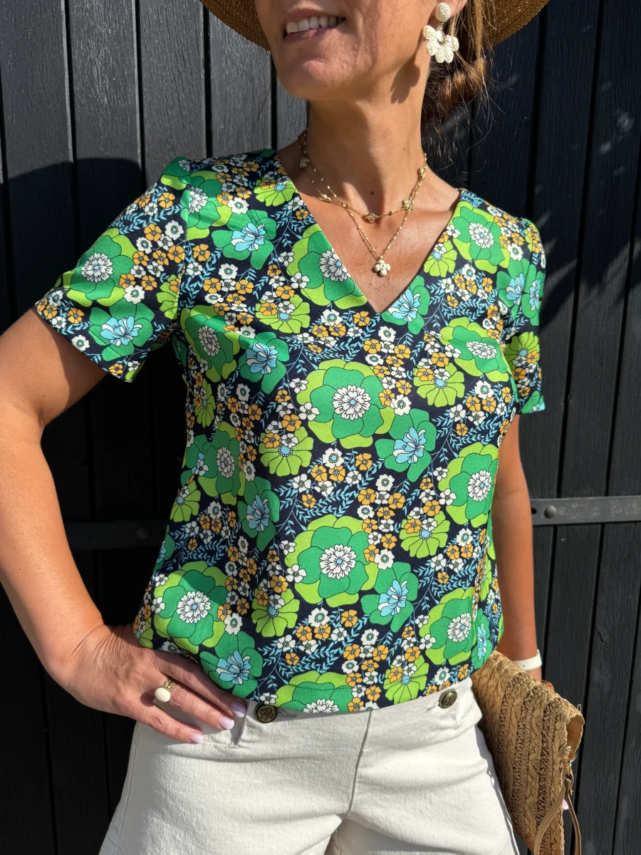 Le col V de ce top met en valeur le décolleté avec une coupe féminine et moderne. Les manches courtes ajoutent une touche de légèreté et de confort, idéales pour les journées plus chaudes. La forme trapèze du top flatte la silhouette, offrant une coupe fluide et élégante qui s’adapte à toutes les morphologies.