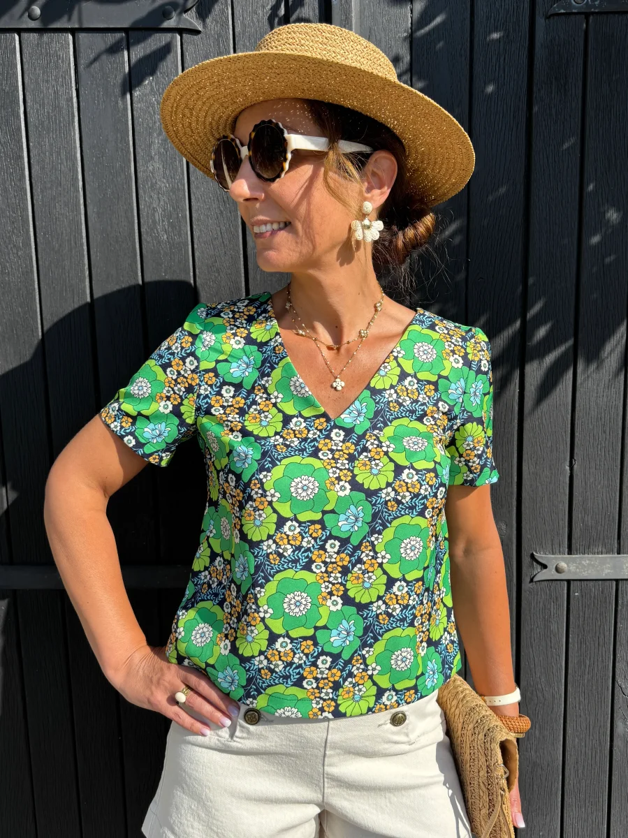 L’imprimé floral, avec des fleurs vertes, crème et jaunes sur un fond marine, crée un motif vibrant et sophistiqué, apportant une touche de fraîcheur et de caractère à cette pièce. La fermeture invisible sur le côté permet une finition discrète et un ajustement parfait mais surtout facilite l’enfilage.