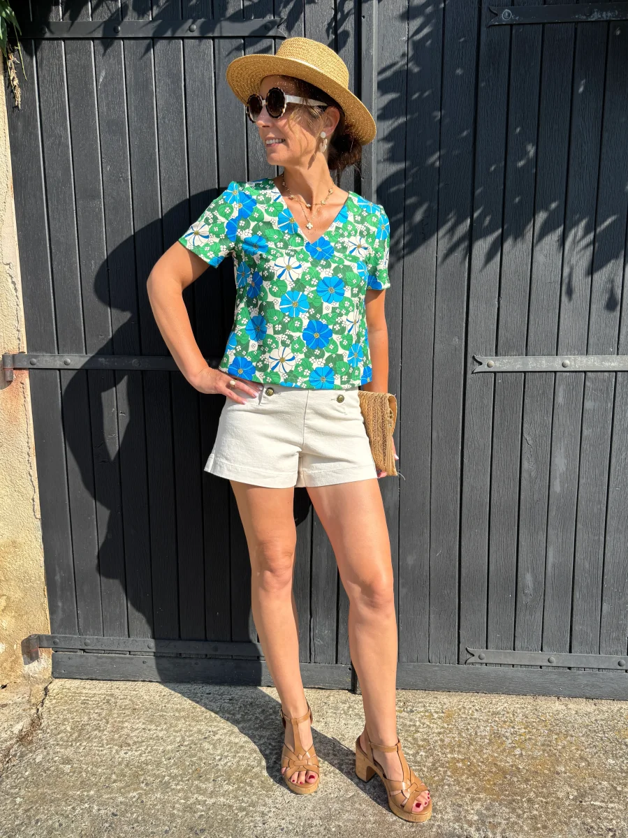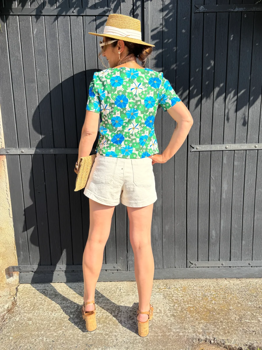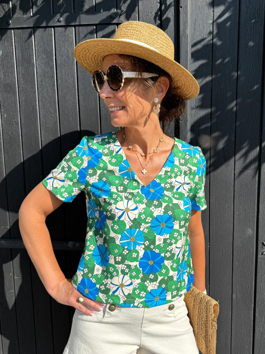 L’imprimé floral, avec des fleurs bleu, jaune, et beige sur un lit de feuille verte et un fond écru, crée un motif dynamique et joyeux, apportant à la fois fraîcheur et élégance à cette pièce. Ce top, avec son design moderne et sophistiqué, est idéal pour un look à la fois décontracté et élégant.