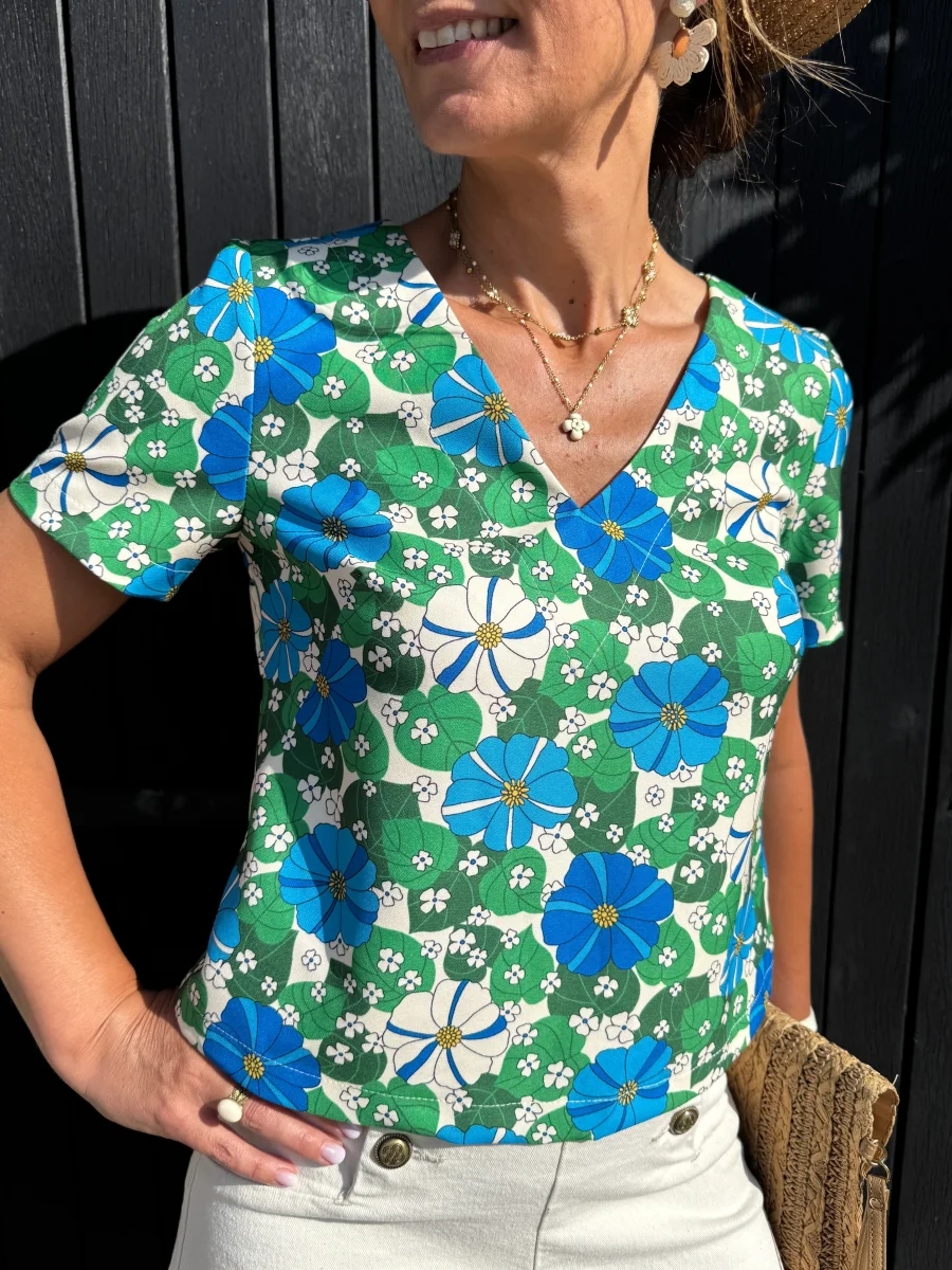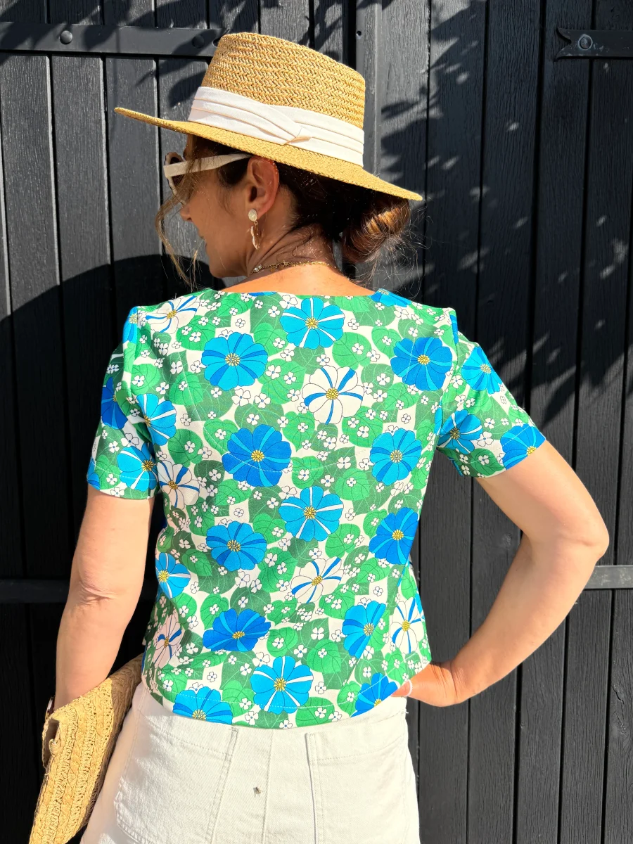Retrouvez ce top SEVENTIES n°126 bleu et vert au style rétro signé Hippocampe dans votre boutique De La Mode la Rochelle.