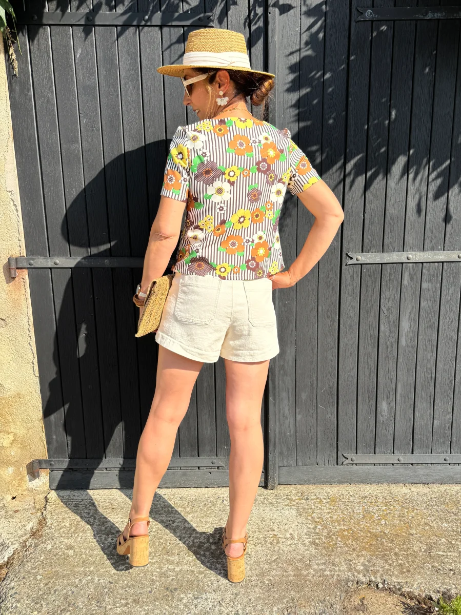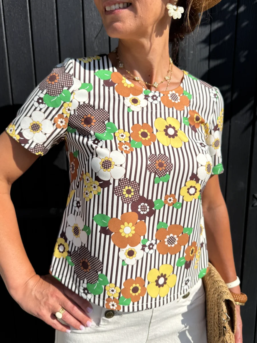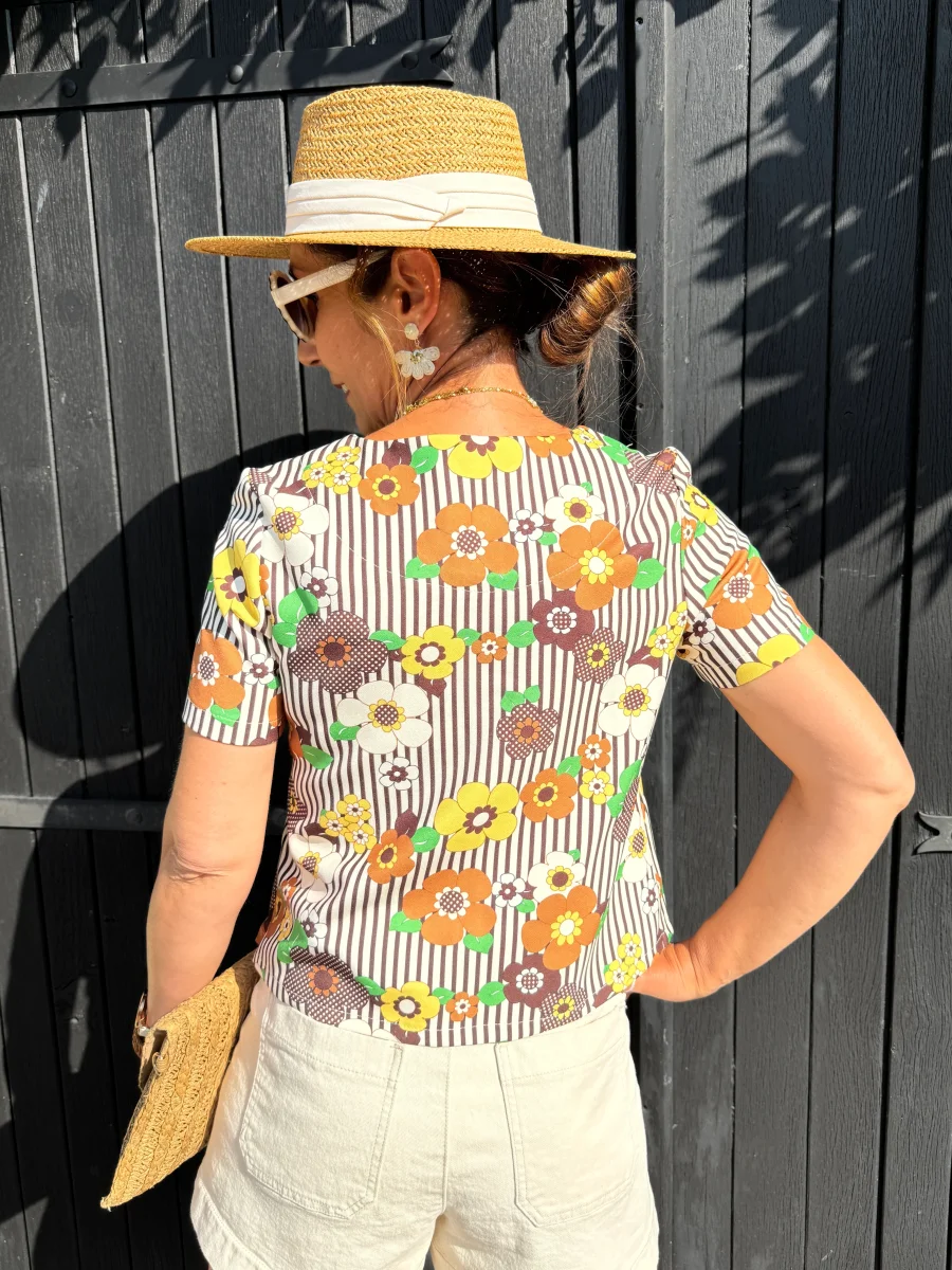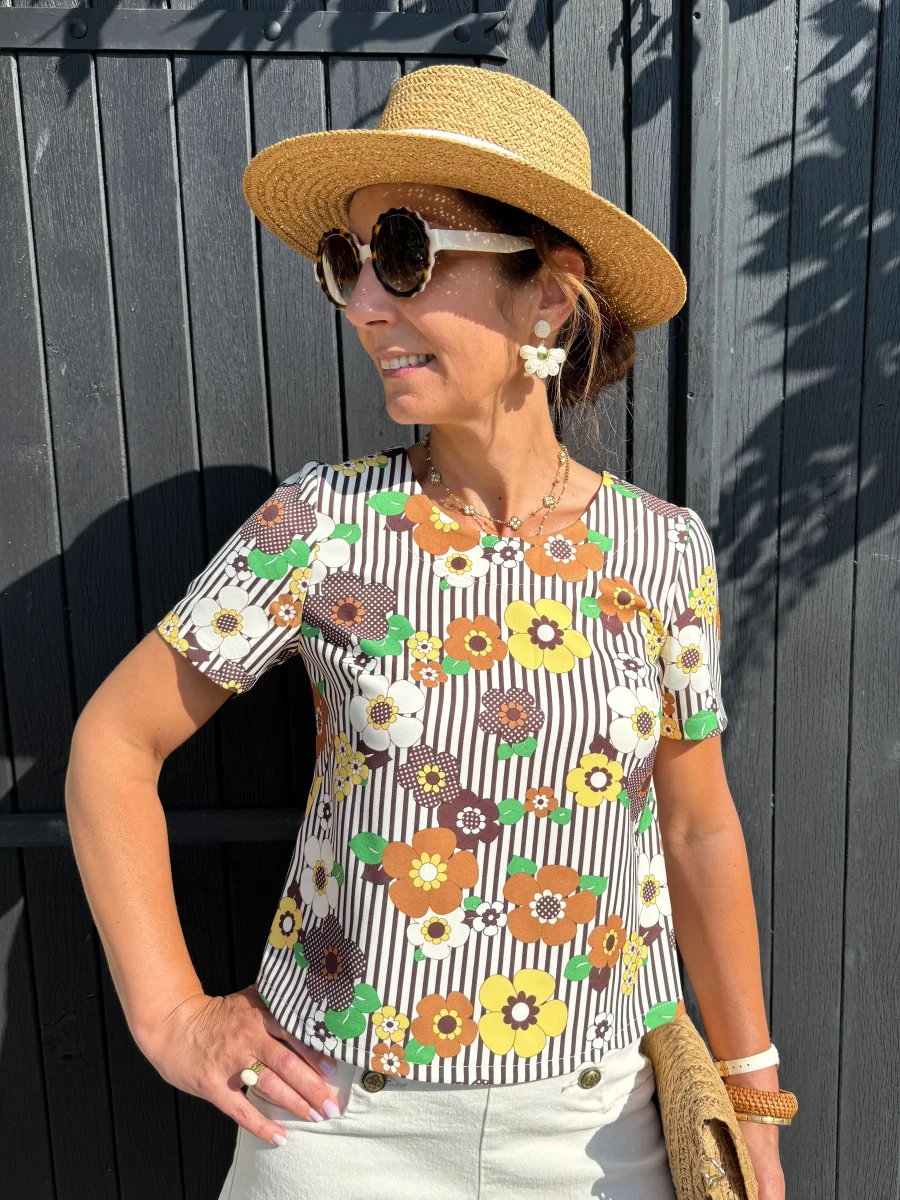 Notre top SEVENTIES n°129 de la marque Hippocampe est une pièce moderne et élégante qui apportera une touche rétro et sophistiquée à votre garde-robe. Sa couleur marron associée à un imprimé floral dans des tons jaune, beige et marron, complété par des feuilles vertes sur un fond beige, crée un motif harmonieux et délicat, parfait pour un look chic et printanier.