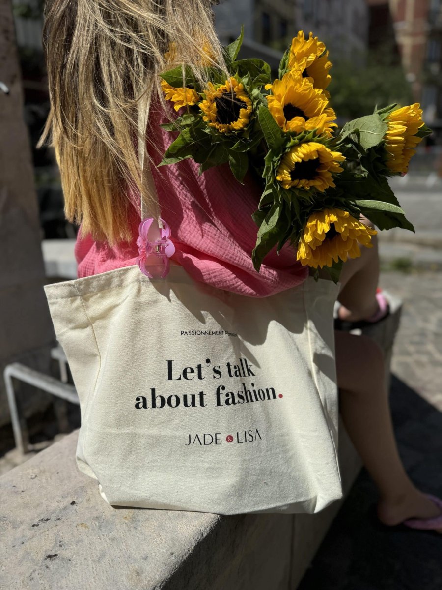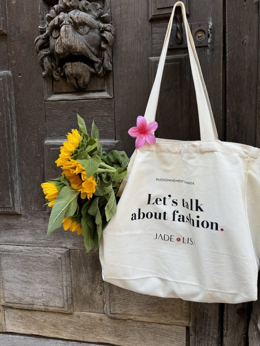 Hauteur 33cm Largeur 40cm Profondeur 15 cm Coton épais Au recto : « Let’s talk about fashion » Au verso : logo Fait avec amour ❤️