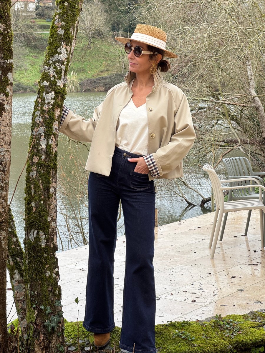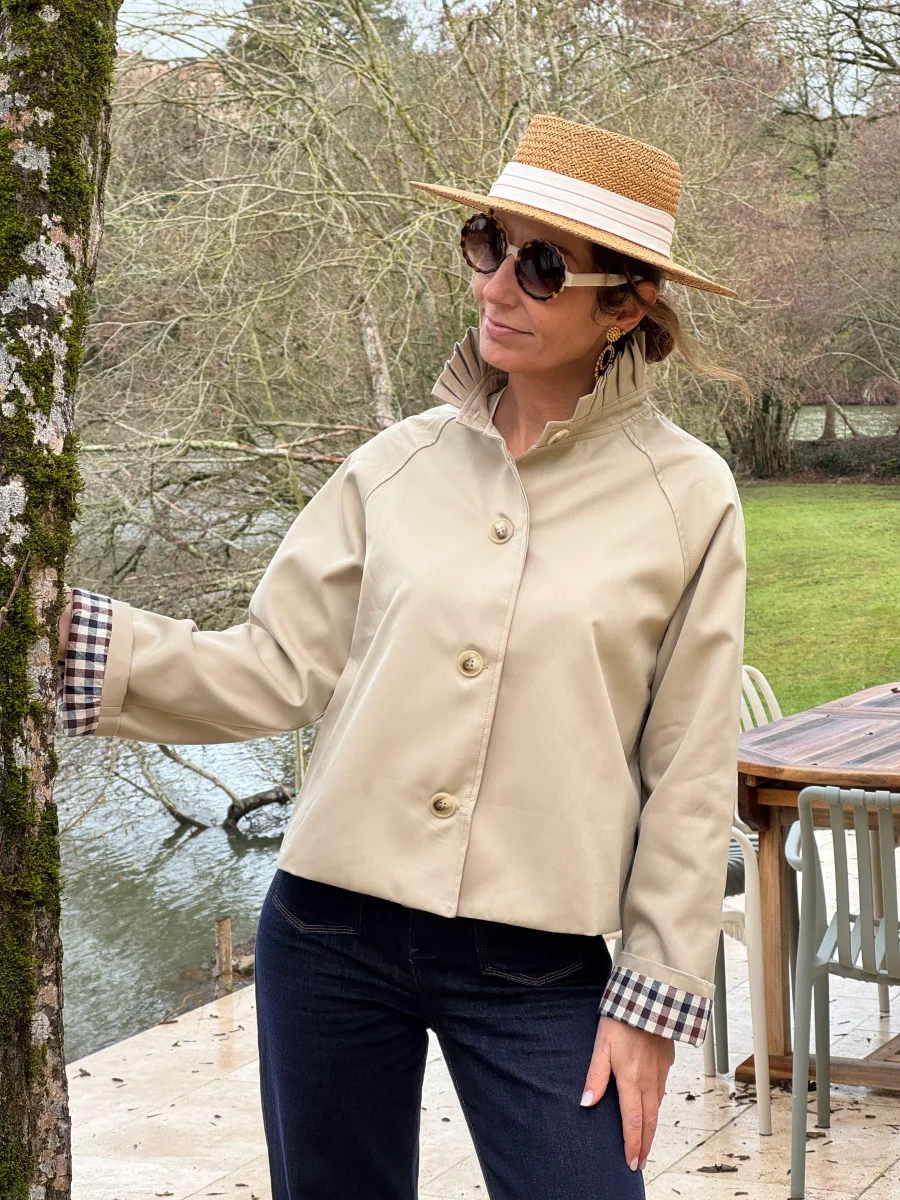 Trench beige court col montant détail vichy marine et chocolat OLIVIA