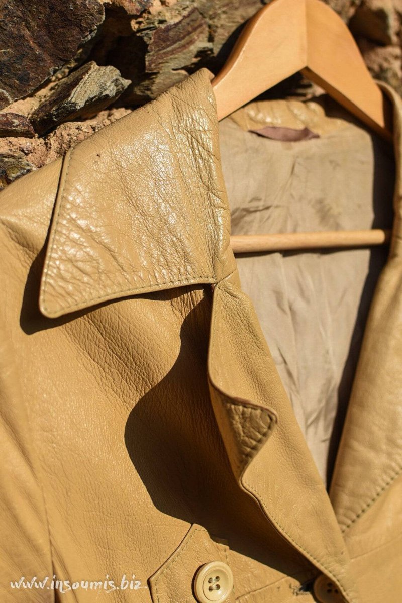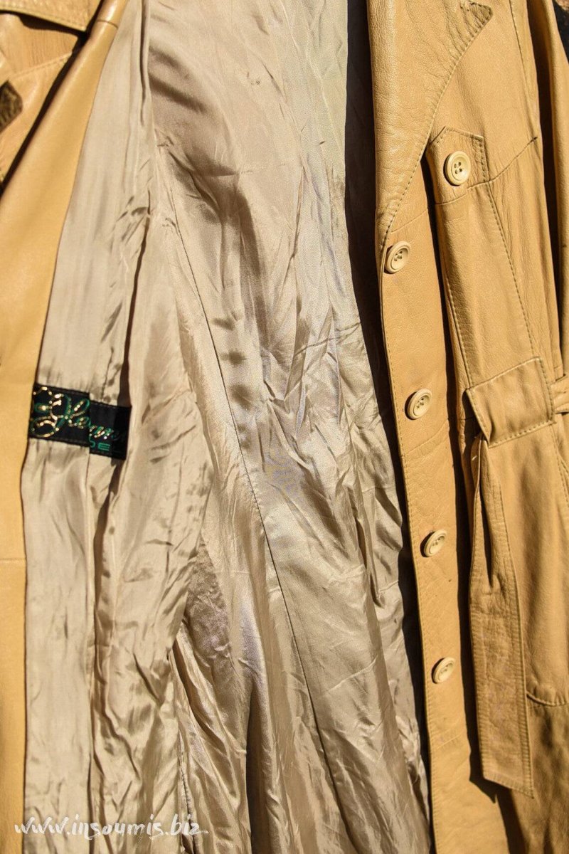 Trench coat long en cuir souple crème début 70s avec ceinture, très bel état, doublure satin sans trous.Marque Heitmann.Taille 38/40 (épaule épaule 42,5cm, longueur bras 60cm, longueur totale 1,14m)