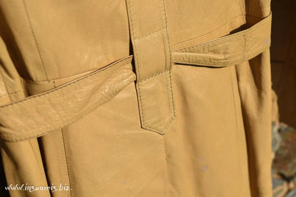 Trench coat long en cuir souple crème début 70s avec ceinture, très bel état, doublure satin sans trous.