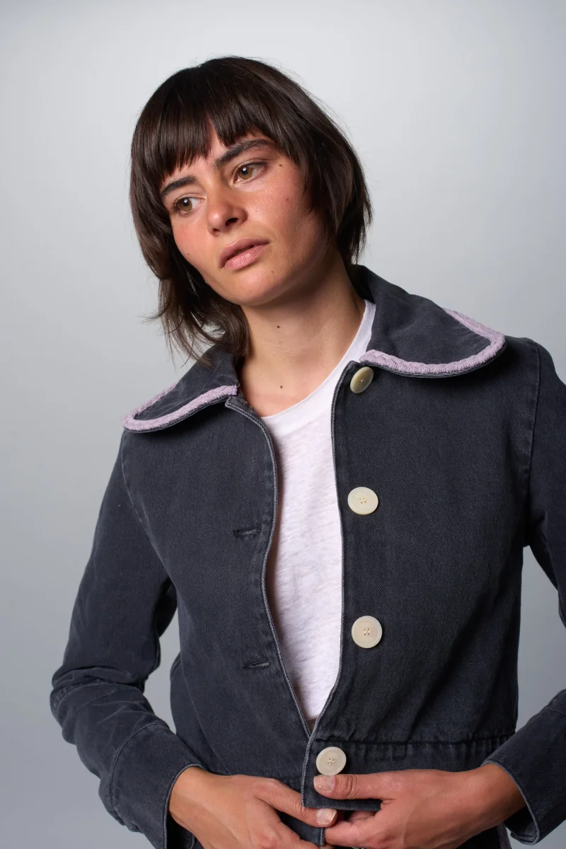 Une nouvelle version de notre veste Daisy en toile denim légère, 100% coton, tissée en Turquie. Une veste courte et élégante avec ses boutons blancs effet nacré subtilement gravés « Côtelé » et un galon de velours côtelé qui souligne le col.