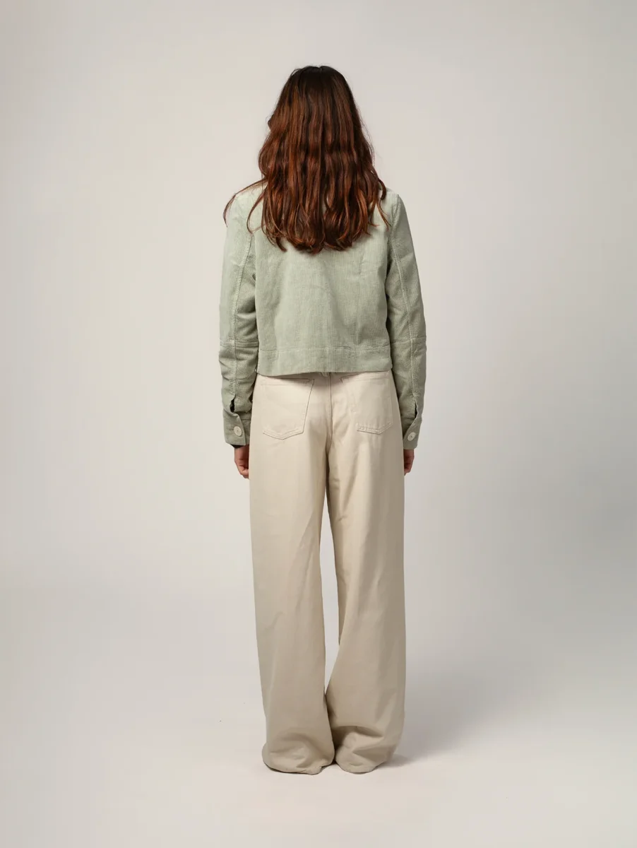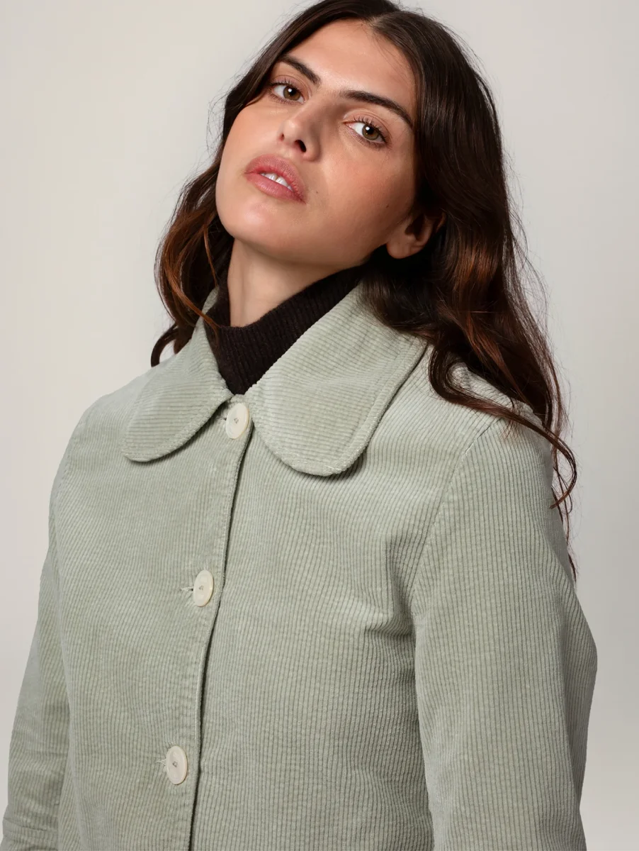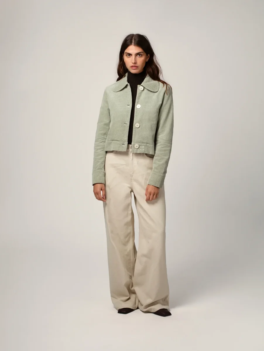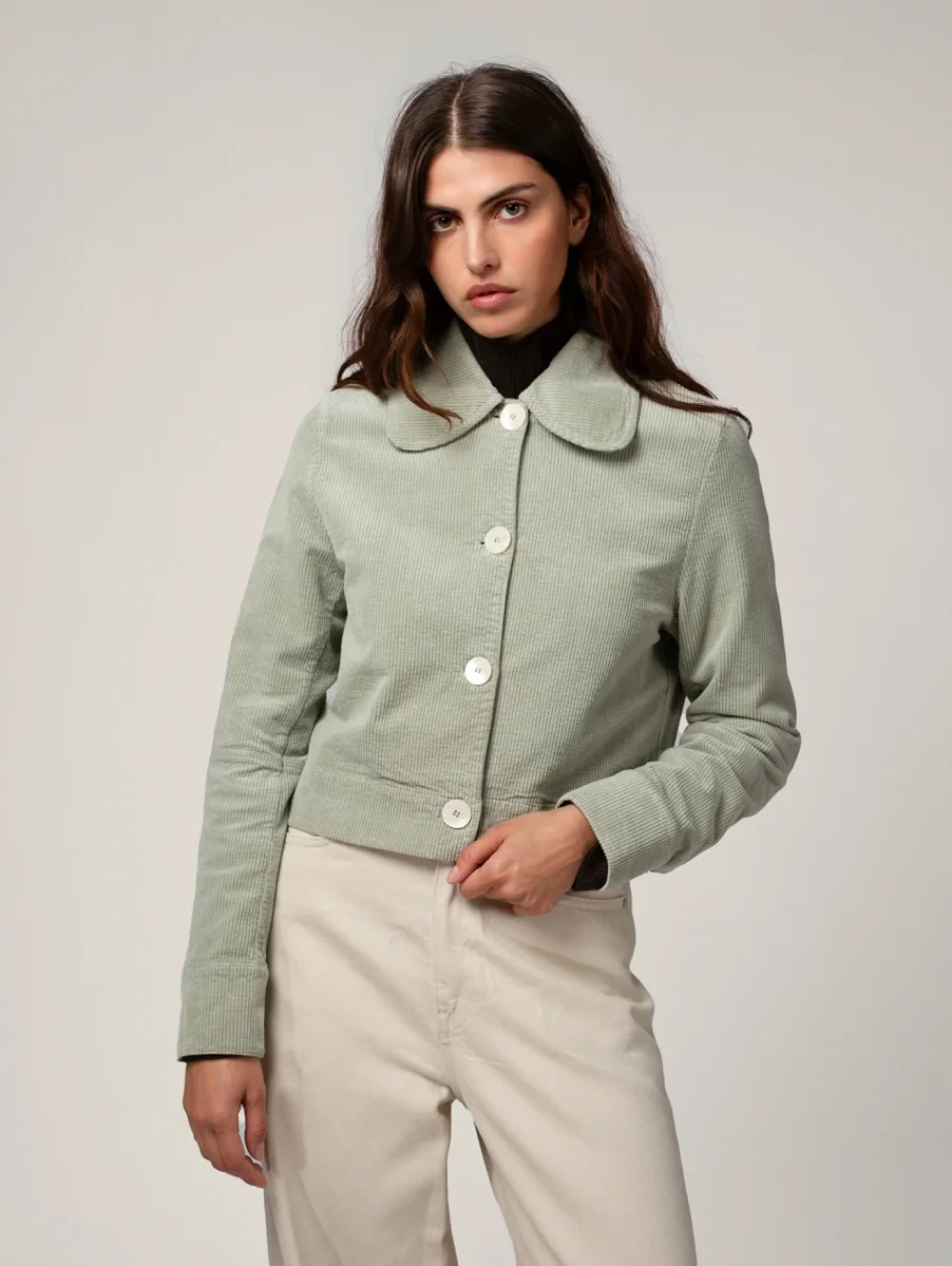 Veste Daisy en Velours Côtelé. Une veste courte et élégante avec ses boutons blancs effet nacré subtilement gravés « Côtelé ». Velours tissé en France à partir de coton biologique.