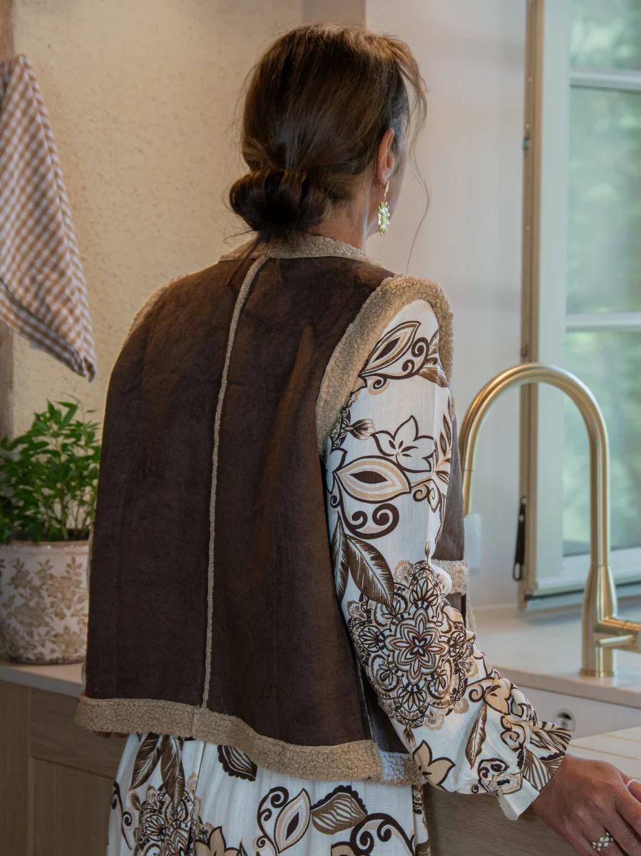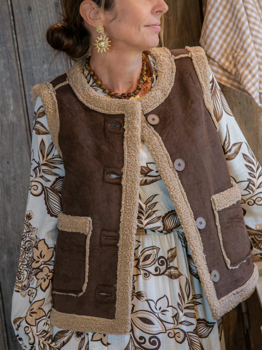 Retrouvez cette veste sans manche chocolat effet mouton retourné dans votre boutique De La Mode la Rochelle.