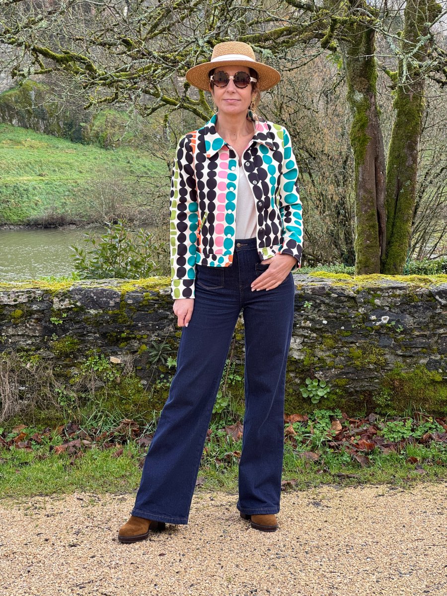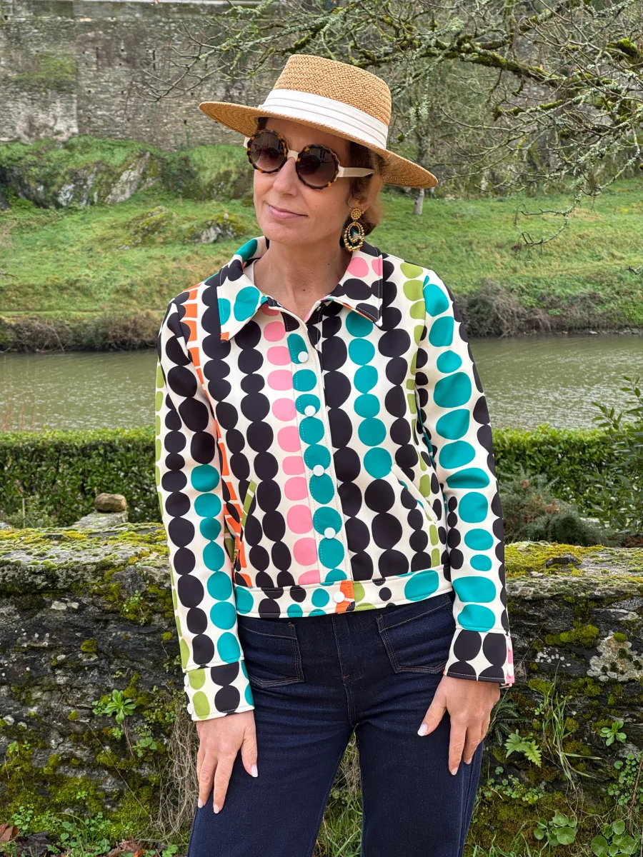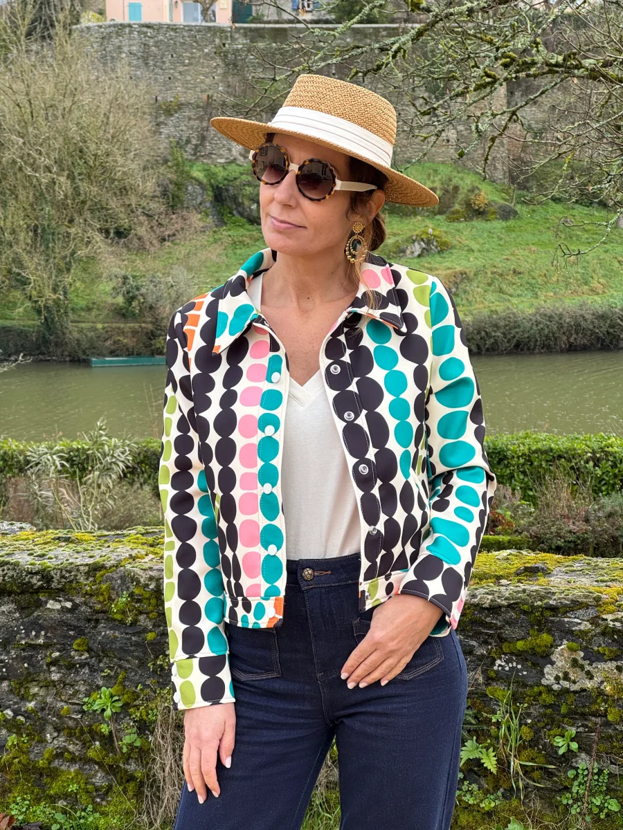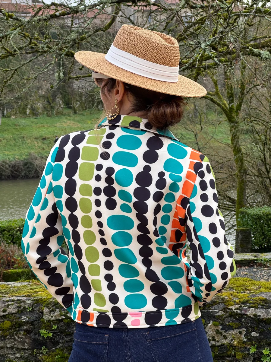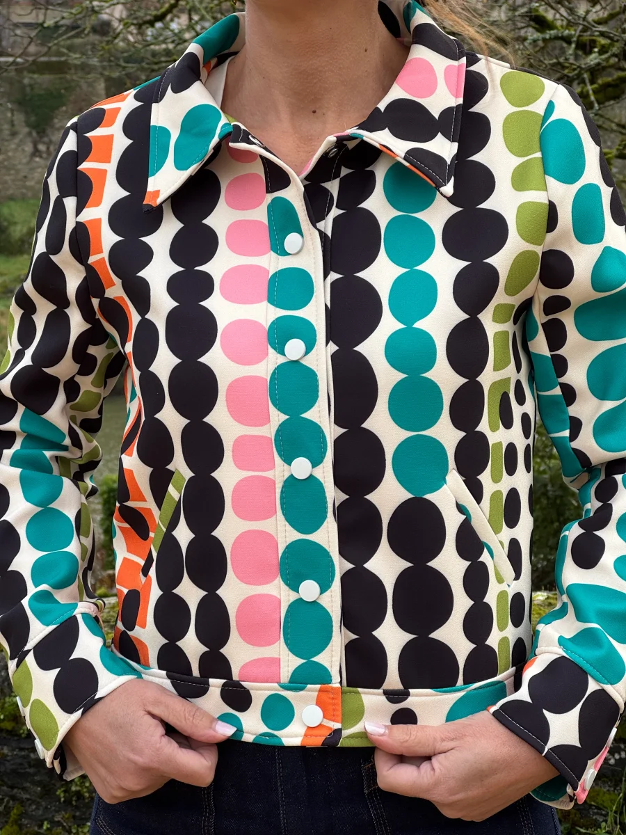 Découvrez notre veste SEVENTIES n°185 de la marque Hippocampe, un blouson en tissu épais beige sublimé par un imprimé géométrique élégant dans des tons, rose, noir, vert, orange et bleu sur un fond beige. Cette veste combine élégance rétro et confort, parfaite pour compléter vos looks du quotidien ou vos tenues plus habillées.