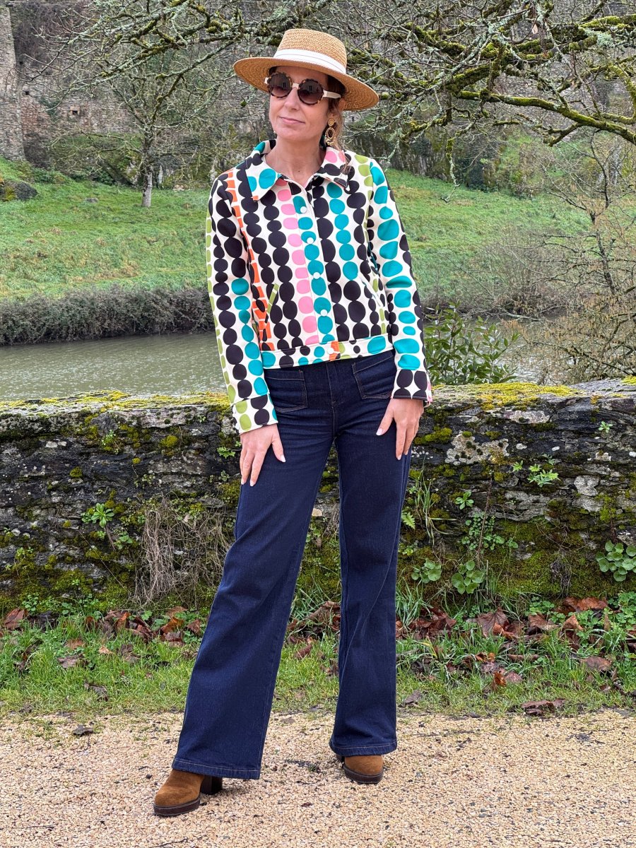 Découvrez notre veste SEVENTIES n°185 de la marque Hippocampe, un blouson en tissu épais beige sublimé par un imprimé géométrique élégant dans des tons, rose, noir, vert, orange et bleu sur un fond beige. Cette veste combine élégance rétro et confort, parfaite pour compléter vos looks du quotidien ou vos tenues plus habillées. Dotée d’un […]